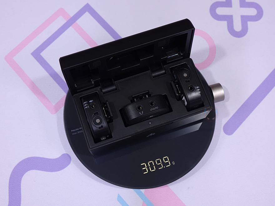 충전케이스(Charging case)를 열어보면, 방금 언급했듯이 내부에 마이크와 수신기가 수납된 것을 확인할 수 있습니다. 그리고, 이렇게 수납된 형태에서 총 무게를 측정해 보면, 약 310g으로 이는 태블릿PC보다 가벼운 무게라 휴대성으로도 최적이라고 할 수 있습니다. 또한, 충전케이스를 열고 닫을 때는 일정각도를 넘었을 때 자동으로 닫히는 자석(magnetic) 방식이라 뚜껑 안쪽에 충격완화를 위한 패드도 부착되어 있죠.