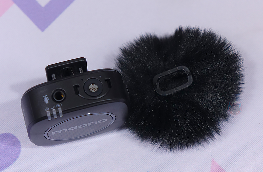 끝으로, 송신기와 수신기에 사용되는 부속품들을 살펴보면, 앞서 확인했듯이 송신기에는 기본적으로 내장 마이크가 탑재되어 있지만, 외부 마이크도 지원해 줍니다. 그래서, 기본적으로 WM821 제품에는 외부 마이크로 3.5mm TRS lavalier 마이크 흔히 말하는 핀-마이크를 2개 제공해주고 있습니다. 참고로, 외부 마이크 길이는 1m입니다. 그리고, 송신기의 내장마이크에도 로우-컷 기능 외에 주변 잡음을 감소시킬 수 있게 윈드-스크린을 제공해주고 있죠. 장착은 간단하게 홈에 맞춰 끼워주면 됩니다.