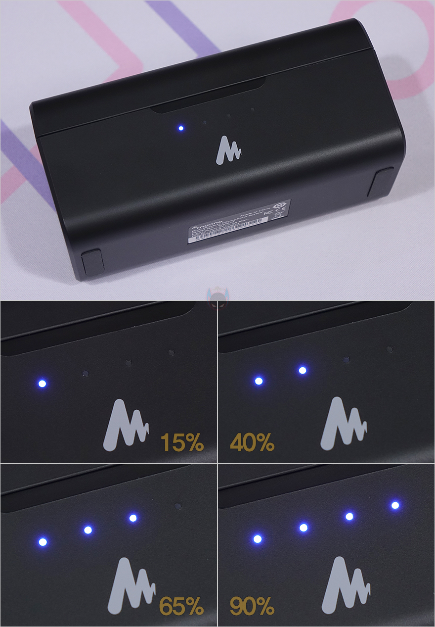 마오노(MAONO) WM821 무선 마이크의 또하나 최대 장점은 바로 충전케이스를 갖추고 있다는 거겠죠. 무선 이어폰처럼 WM821 무선 마이크를 사용하다가 언제든지 충전이 필요할 때는 장소불문하고 전용 충전케이스에 넣고 충전하면 됩니다. 충전케이스(Charging case)의 배터리용량은 2500mAh로 앞서 제품박스에 주요 특징으로 언급했듯이 최대 연속 20시간 사용이 가능합니다. 또한, 송수신기를 켠 상태에서 충전케이스에 넣으면 자동으로 전원이 꺼지면서 충전도 시작하죠. 그리고, 충전케이스 전면에 LED 인디케이터를 통해 배터리 충전 및 잔량 상태도 확인할 수 있는데, 4개의 LED는 각각 15~25% 단위씩 잔량 상태를 표시해 줍니다.