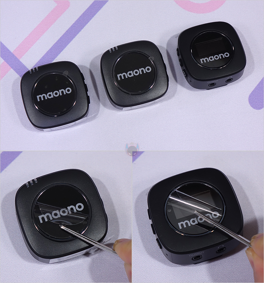 충전케이스에서 마이크와 수신기를 꺼내 본격적으로 살펴보면, 일단 송신기(Transmitter) 역할의 마이크(Mic)는 2개, 수신기(Receiver)는 1개로 구성되어 있습니다. 앞서 언급했듯이 2채널 마이크죠. 송수신기 모두 마오노 로고(Logo)가 새겨진 전면에는 보호비닐이 부착되어 있으며, 판매 시 포장상태에서 충전이 되지 않도록 접지 부분에도 보호비닐이 부착되어 있습니다. 참고로 마이크의 무게는 약 34g이고, 수신기의 무게는 약 36g입니다.