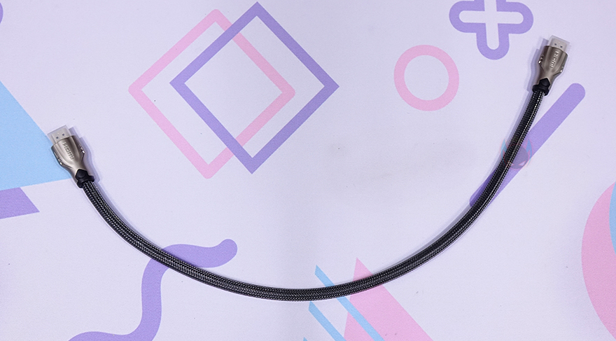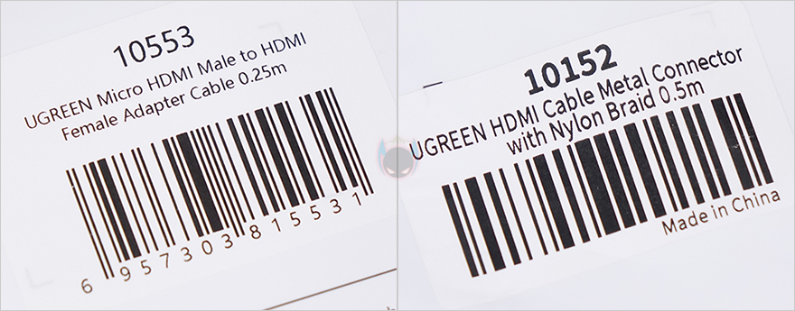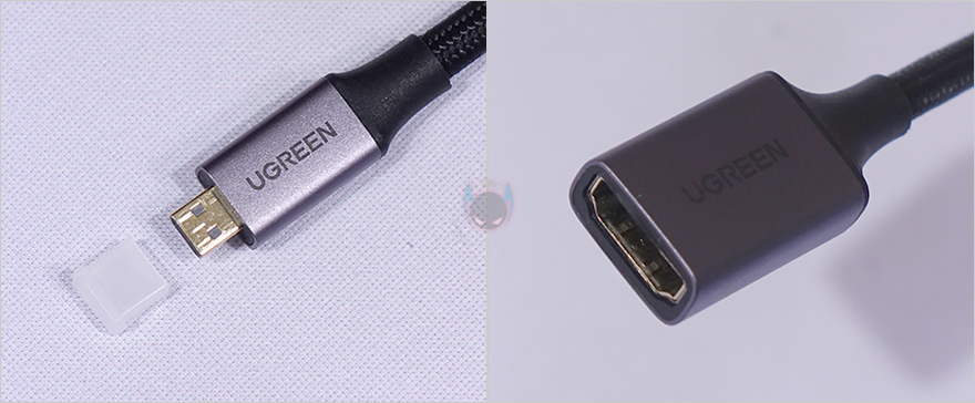 그리고, 또하나의 HDMI 케이블은 마이크로 HDMI 어댑터 제품으로 길이는 25cm이며, 꼬임방지를 위해 직조케이블형태로 슬리빙처리를 했습니다. 또한 , 어댑터 제품답게 한쪽에는 기본 HDMI Type-A와 연결되는 포트가 적용되었고, 반대쪽에는 카메라 같은 장치에 사용되는 마이크로 HDMI 인터페이스를 갖추고 있죠.