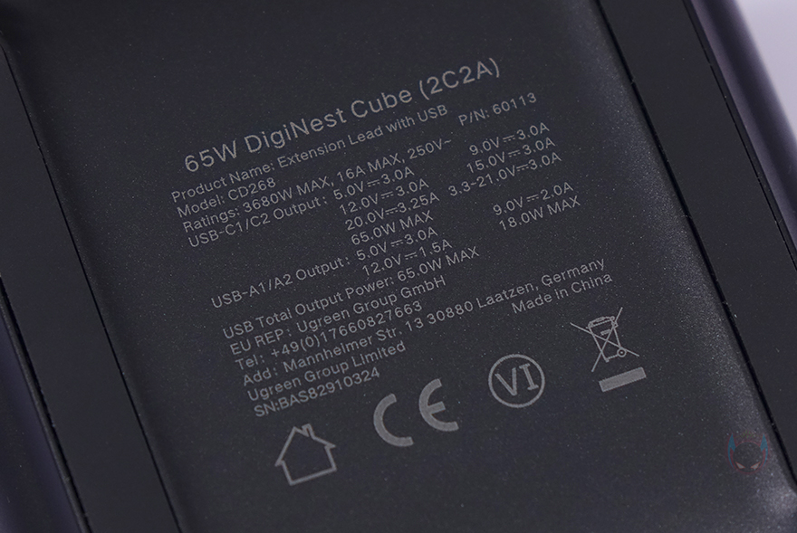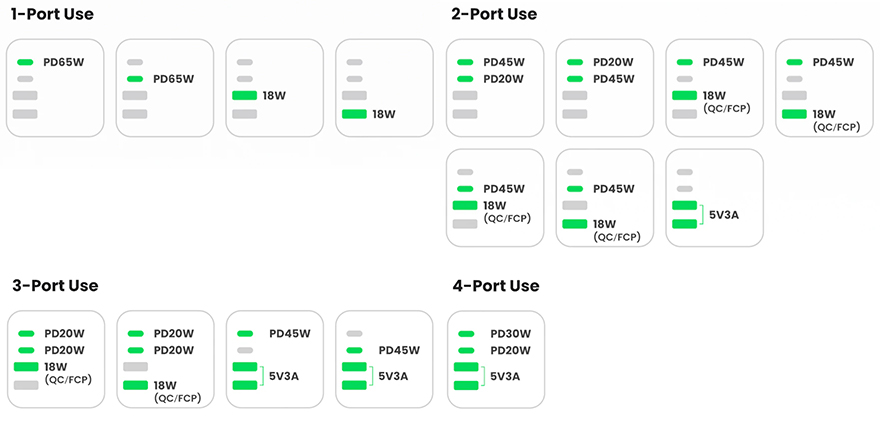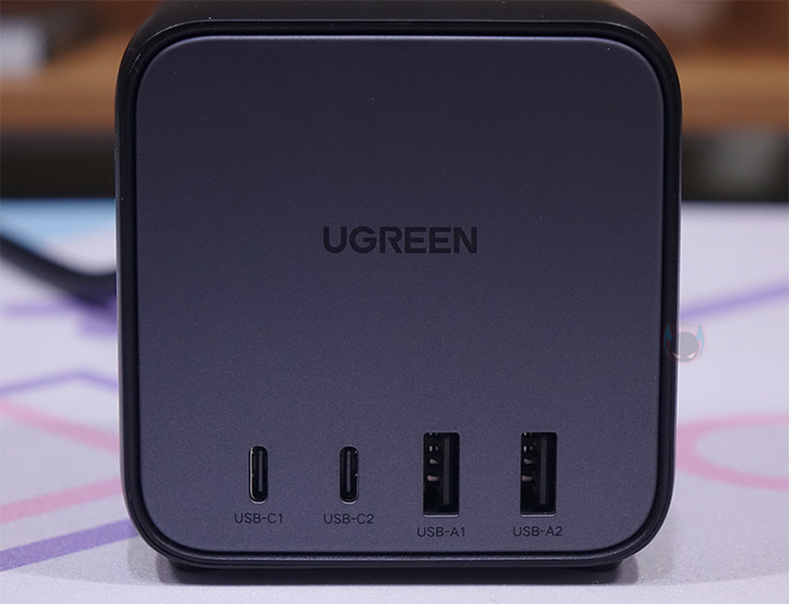 전면에는 그레이색상의 패널과 함께 유그린 로고(Logo)를 중앙에 새겨놨으며, 아래에 4개의 USB 충전 포트를 배치해놨는데, Type-C 포트 2개, Type-A 포트 2개로 Type-C 포트는 모두 최대 65W 충전속도를 지원하며, Type-A 포트는 최대 18W 충전속도를 지원합니다. 물론, 포트 1개만 사용했을 때 최대 속도이며, 65W 지원은 GaN(질화갈륨) 방식이죠. 그리고, Type-C 포트 2개만 사용했을 때는 각각 45W와 20W로 나뉘고, Type-A 포트 2개만 사용했을 때는 각각 15W로 지원하며, Type-C와 A 포트 1개씩 함께 사용했을 때는 각각 45W와 18W로 지원, 3개의 포트, 4개의 포트 사용했을 때 역시 충전속도가 모두 다릅니다. 물론, 이런 충전속도 표기는 몸체 밑바닥 부분에도 표기를 해놨기 때문에 사용 전에 한 번씩 참고하면 됩니다. 그리고, 밑바닥 양쪽에는 미끄럼방지 고무패드도 기본 부착되어 있죠.