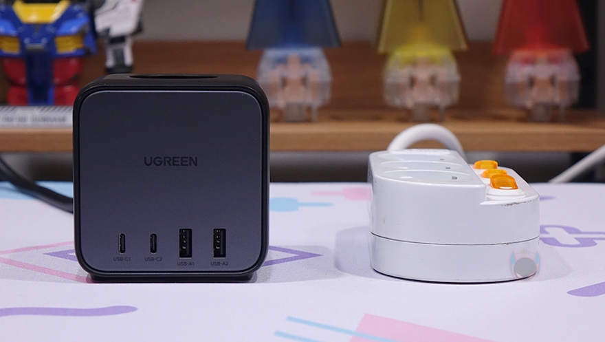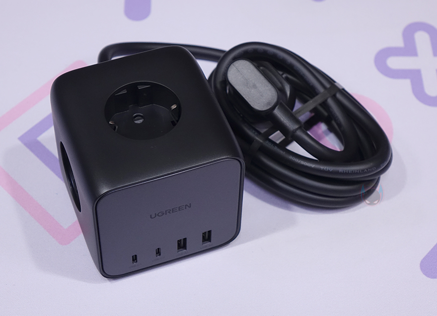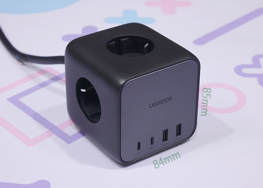 유그린(Ugreen) 65W DigiNest Cube 파워스트립을 살펴보면, 가장 먼저 눈에 들어오는 부분은 역시 디자인 부분으로 라운딩처리의 정사각형 모양으로 큐브(Cube) 형태를 가지고 있습니다. 앞에서 잠깐 언급했듯이 일반적인 파워스트립 형태와는 많이 다르죠. 특히, 국내 멀티탭 제품과 비교해 보면, 콘센트만 꽂는 멀티탭보다 길이가 확실히 짧으면서 높이만 더 높여서 3구 콘센트를 갖추고 있는 형태죠.