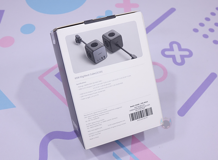제품박스부터 살펴보면, 모델명과 함께 전면에 제품 이미지를 담고 있는데, 한눈에 봐도 왜 모델명에 Cube라는 단어가 들어갔는지 알 수 있고, 기존의 파워스트립 제품들보다는 사이즈가 작다라는 것도 쉽게 짐작할 수 있습니다. 또한, 모델명에 65W라는 문구를 확인할 수 있어서, USB 충전 지원이 최대 65W라는것도 짐작할 수 있죠.