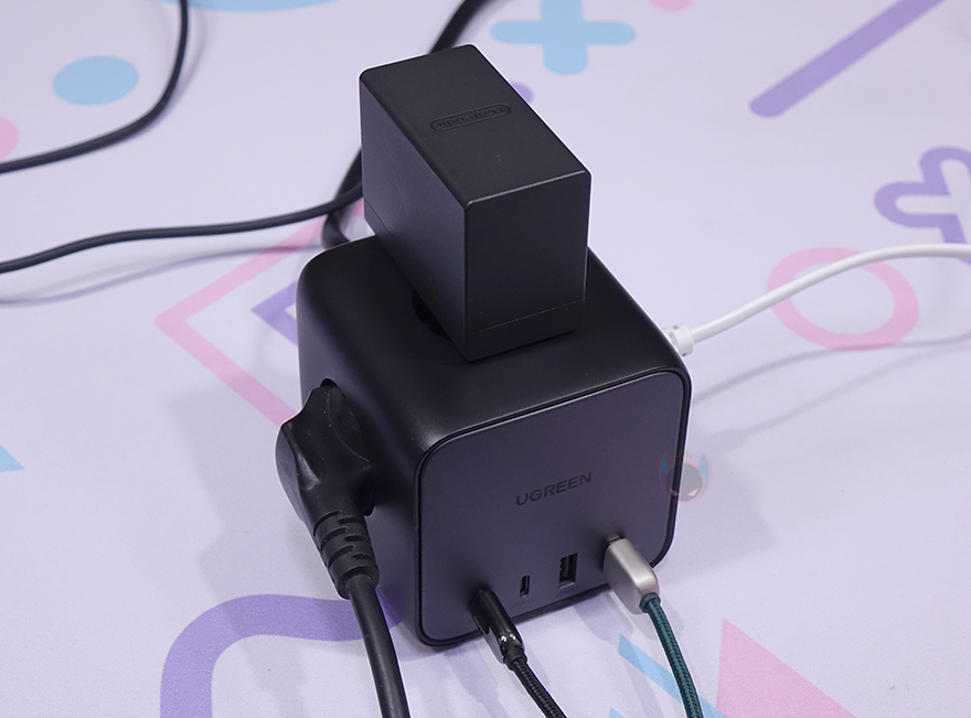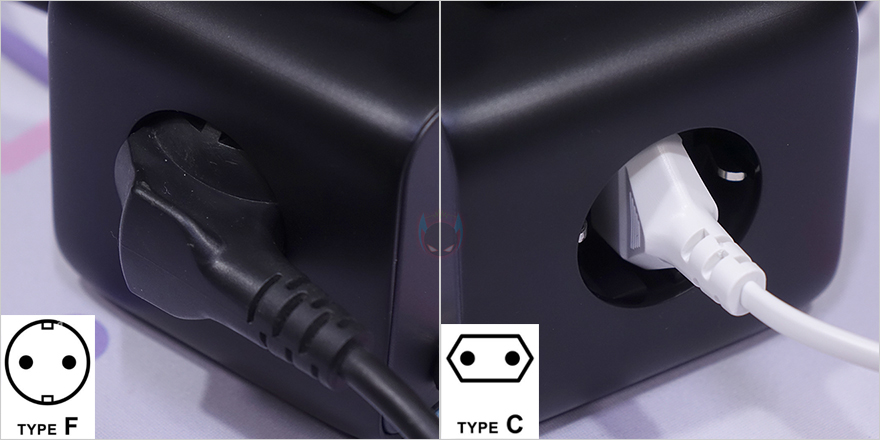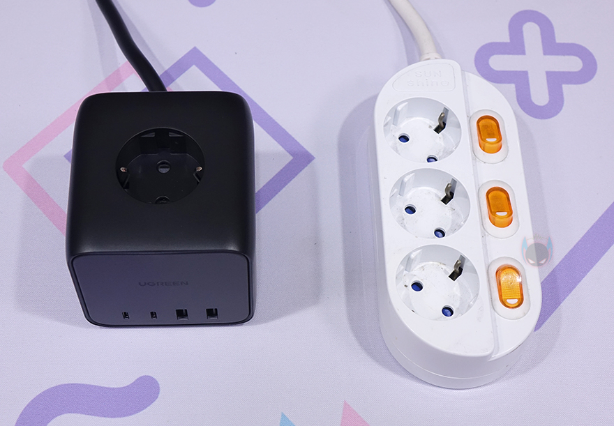 직접, 유그린(Ugreen) 멀티탭 65W DigiNest Cube 파워스트립을 사용해보면, 일단 3구 콘센트에는 국내 전기규격인 220V 플러그를 유형에 상관없이 모두 꽂을 수 있습니다. 쉽게 말해, 둥근 형태의 Type-F, 납작한 형태의 Type-C 같은 흔히 국내에서 볼 수 있는 220V 플러그는 모두 꽂아도 헐겁지 않게 잘 맞습니다. 물론, 어댑터 방식의 플러그도 잘 맞죠.