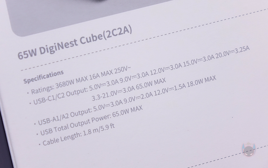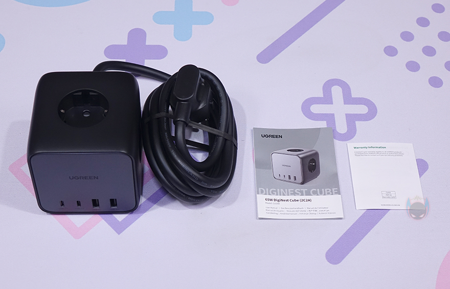 박스 후면에는 제품 앞뒤 이미지를 한 번 더 담고 있으며, 아래에는 제품의 기본 사양을 표기해놨는데, 콘센트를 통한 최대 전력량부터 각 USB포트의 충전 최대 전력, 그리고 케이블 길이를 확인할 수 있으며, 제품 박스를 열어 포장을 확인하면 기본 비닐포장으로 처리되어 있습니다. 제품 구성은 간단하게 65W DigiNest Cube 파워스트립, 제품설명서, 보증서로 이루어져 있죠.