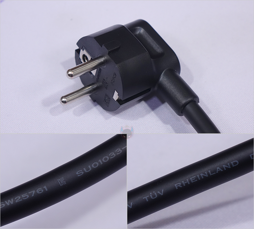 끝으로, 몸체 후면에는 전원 On/Off 스위치를 적용해 한 번에 전원 관리를 할 수 있도록 했으며, 전원케이블은 총 1.8m 길이에 국내 220V 규격에 맞춘 EU 플러그 형태를 갖추고 있습니다. 또한, 전원케이블 역시 국내 전기용품안전(KC)인증 뿐만 아니라 글로벌 전자 안전인증으로 유명한 TÜV 라인란드(TÜV Rheinland) 인증까지 받았습니다.