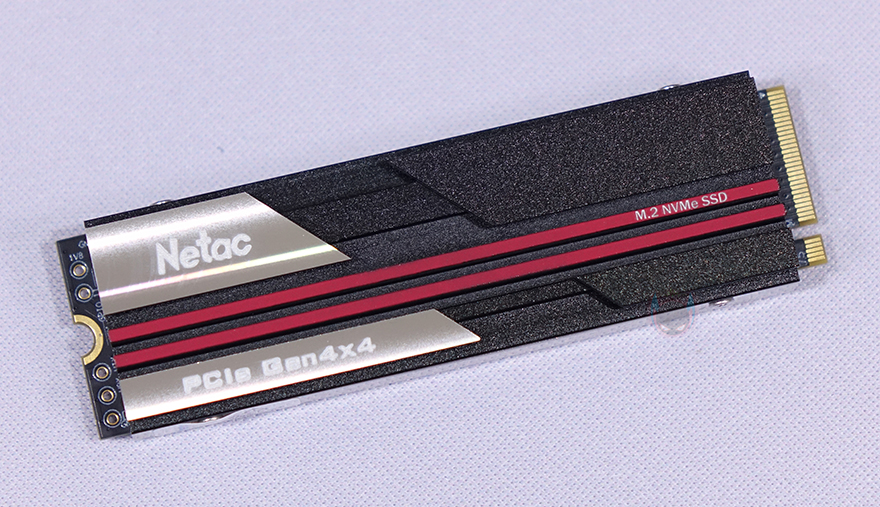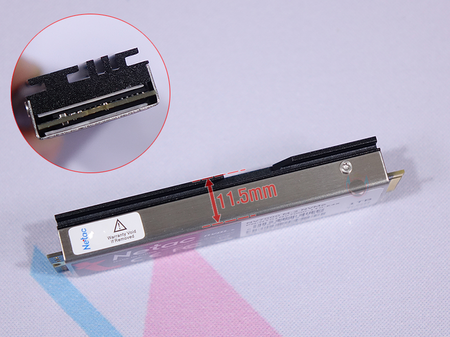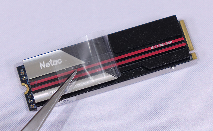 Netac NV7000 SSD를 본격적으로 살펴보면, 개봉시에는 방열판(Heatsink) 표면에 보호비닐이 부착되어 있으며, 비닐을 벗기고 방열판을 보면 앞뒤로 부착된 것을 확인할 수 있습니다. 그리고, 후면 방열판에는 다시 한번 용량표기를 확인할 수 있으며, 측면에서 보면 전체 두께가 약 11.5mm이고, 상판 방열판이 두껍다란 것을 확인할 수 있습니다. 또한, 상판 방열판에는 Netac 로고(Logo)와 PCIe 4.0x4 표기에 나름대로 디자인에 포인트는 주는 레드라인(Red-line) 디자인도 적용하고 있죠.