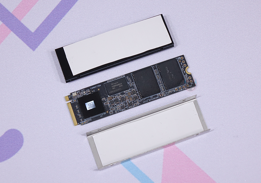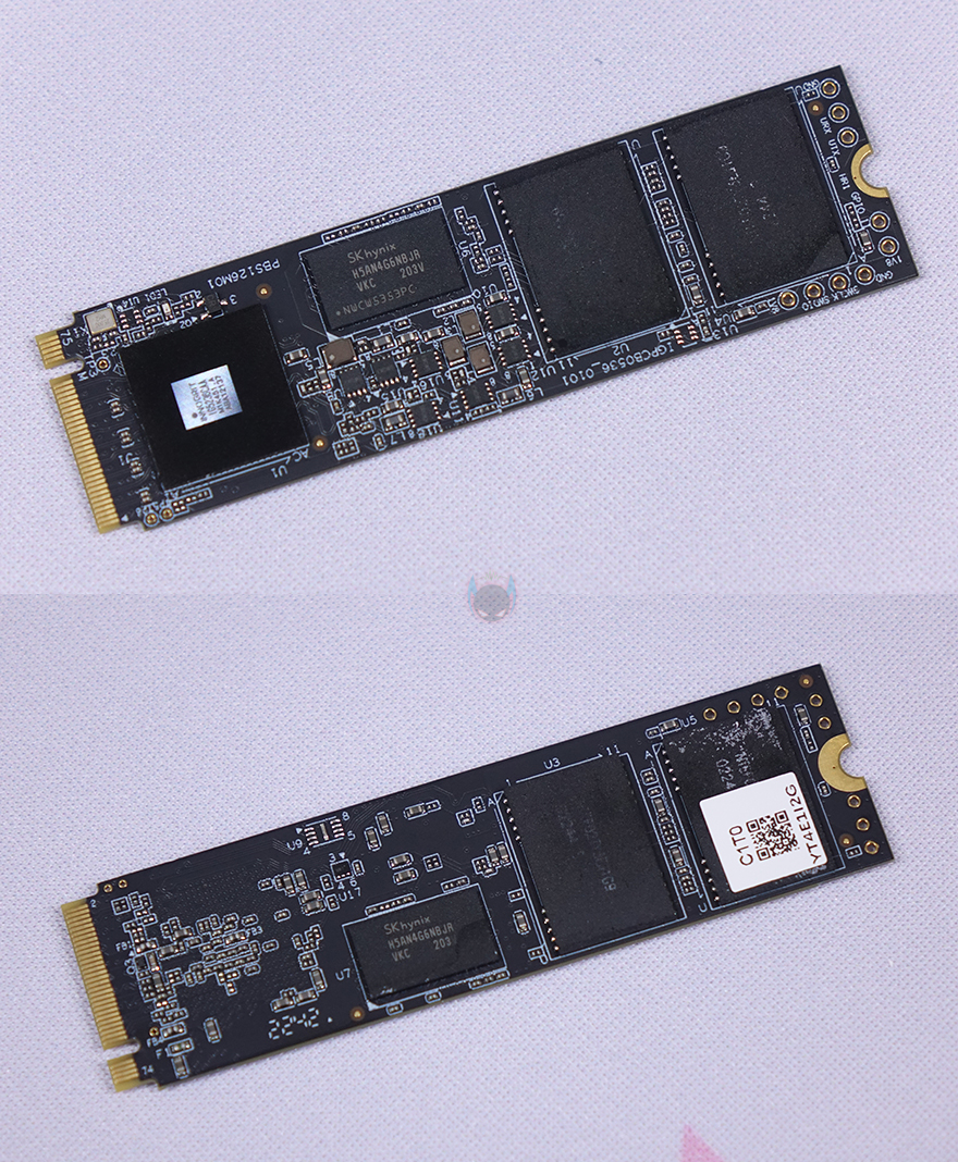 상판과 하판 방열판을 결합해주는 측면 나사를 풀면 방열판을 분리할 수 있는데, 분리해서 살펴보면, 상하 방열판 안쪽에 모두 발열해결을 위해 써멀패드(Thermal-Pad)가 기본 부착되어 있습니다. 그리고, PCB 기판을 살펴보면, 앞뒤로 낸드플래시가 적용되어 있고, DRAM도 적용되어 있는 것을 확인할 수 있죠. 물론, 컨트롤러 칩셋도 확인할 수 있는데, 컨트롤러 칩셋은 INNOGRIT사의 IG5236으로 PCIe 4.0x4 지원 칩셋입니다. 또한, DRAM 같은 경우에는 SK 하이닉스(Hynix) DDR4 2666MHz 4GB(256Mx16) 용량이 되겠습니다.
