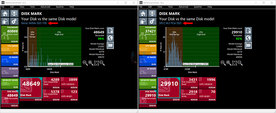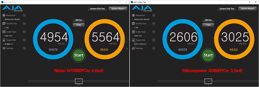 좀 더 추가적인 벤치마크로 NV7000 SSD와 PCIe 3.0x4 SSD의 속도 성능 비교를 해보는데, TxBENCH, AJA System Test, PerformanceTest 프로그램 같은 간단하게 저장장치의 속도를 측정해주는 벤치마크 프로그램에서도 NV7000 SSD가 PCIe 3.0x4 SSD를 월등히 앞서는 결과값을 보여줍니다. 대략 1.5~2배가량의 차이를 보여주죠.