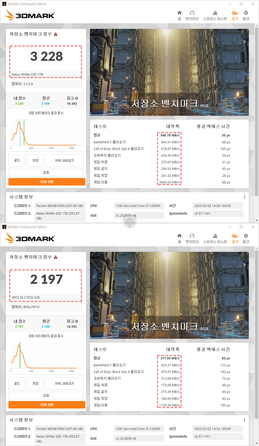 끝으로, 시스템 벤치마크로 유명한 PCMark 10과 3DMark로도 저장장치 성능과 속도 비교를 해봤는데, 성능 점수에서나 대역폭 속도 비교에서도 모두 PCIe 4.0x4 규격의 NV7000이 PCIe 3.0x4 SSD의 성능을 앞서는 결과를 보여줬습니다. 특히, 대역폭에서도 2배 가까이 차이가 나기때문에, 실제 프로그램 작업이나 게임 로딩 시 체감차이가 충분히 있을 수 있습니다.