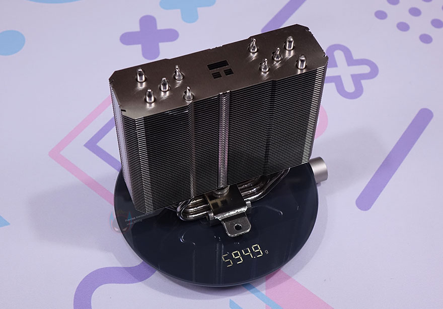 써멀라이트 TA140 EX CPU쿨러의 히트싱크부터 상세하게 살펴보면, 쿨러 전체는 니켈(Nickel) 도금처리가 되어있으며, 히트싱크의 무게는 약 595g입니다. 그리고, 방열핀은 총 53개가 사용되었으며, 방열핀 중앙에는 써멀라이트 로고(Logo)를 홀-방식으로 적용해 놨죠. 또한, 방열핀 측면은 전면에서 흡입되는 공기 흐름을 측면 틈으로 빠지지 않고 후면으로 신속 전달되도록 닫혀있습니다.