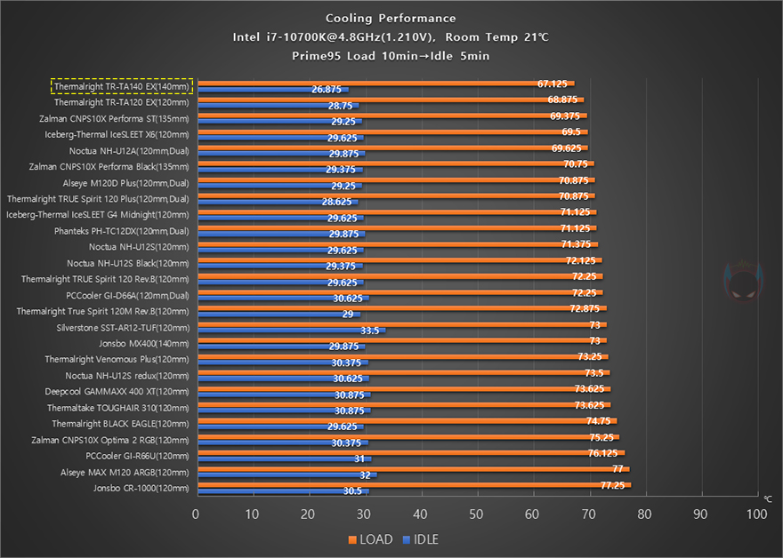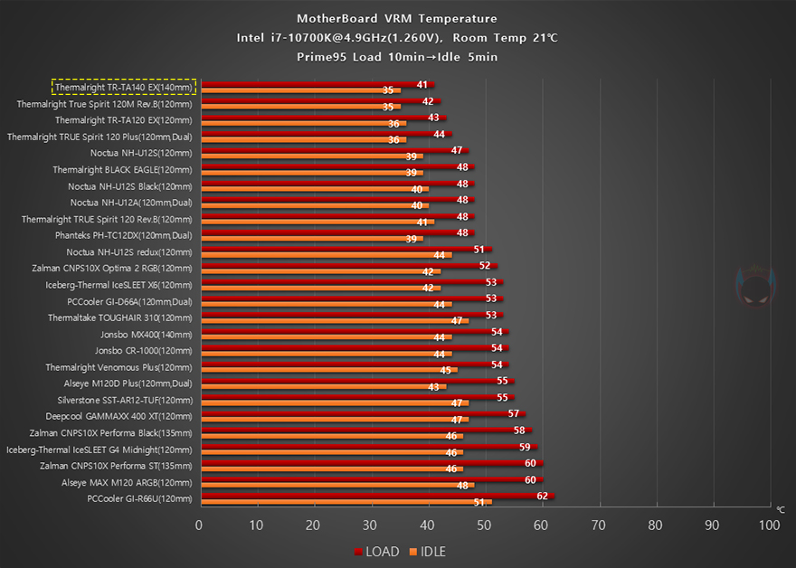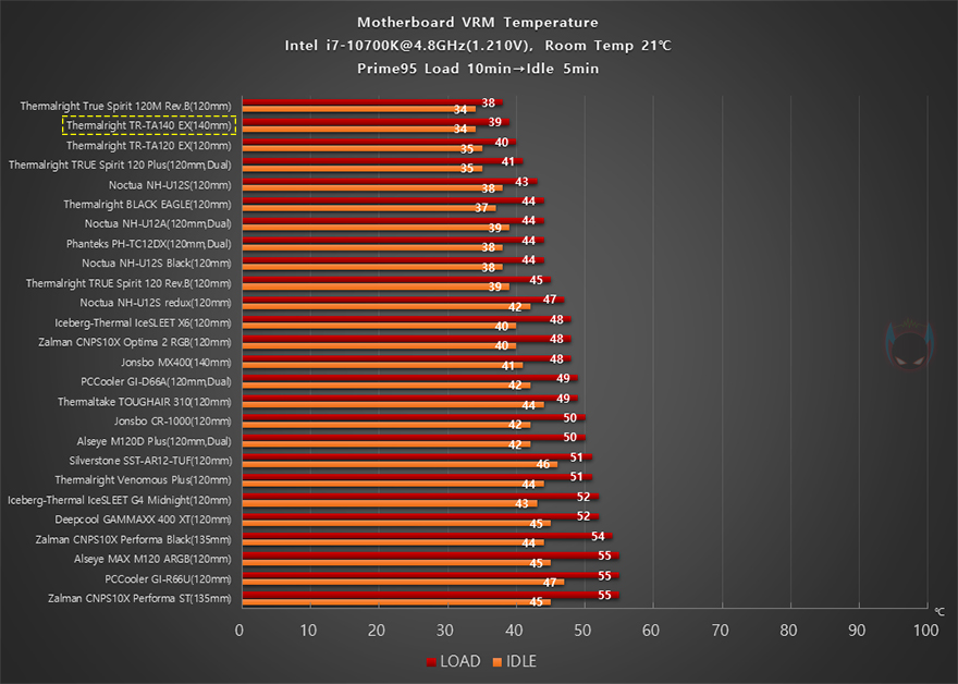 이제 써멀라이트(Thermalright) TA140 EX CPU쿨러의 성능을 확인해 보는데, 인텔 i7-10700K CPU를 1차(4.8GHz)와 2차(4.9GHz) 오버클럭으로 나뉘어서 Prime95 프로그램을 통해 10분간 100% Load 상황과 5분간 Idle 상황에서 각각 CPU 온도와 전원부에 쿨링영향으로 전원부 온도를 비교했습니다. 먼저, 1차(4.8GHz) 오버클럭에선 지난 시간에 살펴보몬 TA120 EX 모델이 120mm 타워형 쿨러로 최고 성능을 보여줬는데, TA140 EX는 140mm 팬으로 이보다 더 낮은 온도로 최고 성능을 보여줬으며, 전원에 쿨링효과 역시 TA120 EX보다 낮은 온도로 좀 더 좋은 성능을 보여줬습니다.