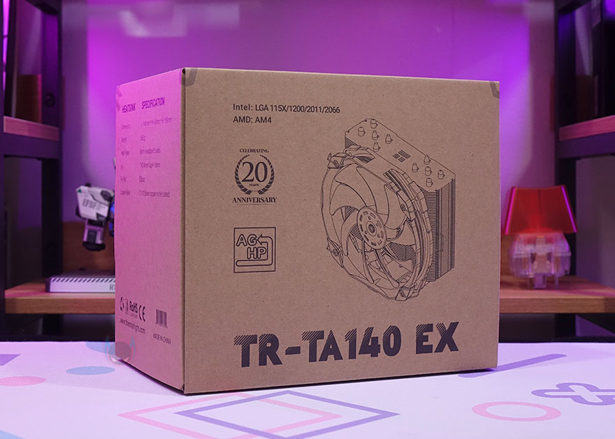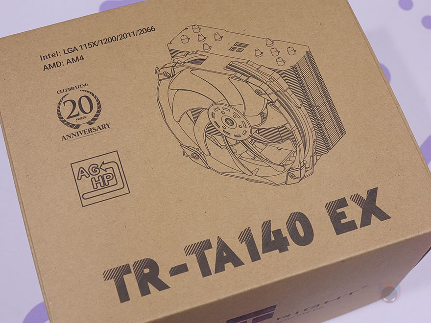 써멀라이트(Thermalright) 제품들은 제품박스 디자인이 화려하지 않은 것이 특징이죠. TA140 EX 역시 순수 박스 종이 색상에 내용만 담고 있는데, 전면에는 모델명과 함께 제품 이미지를 담고 있으며, 20주년 표기와 소켓 지원도 간단히 확인할 수 있습니다. 물론, 박스 양쪽 측면에는 TA140 EX의 히트싱크(Heatsink)와 TL-D14X 팬(Fan) 사양을 각각 상세하게 표기해 놨으며, 박스 후면에는 히트싱크와 팬이 장착된 형태에서 주요 특징을 표기해 놨습니다.
