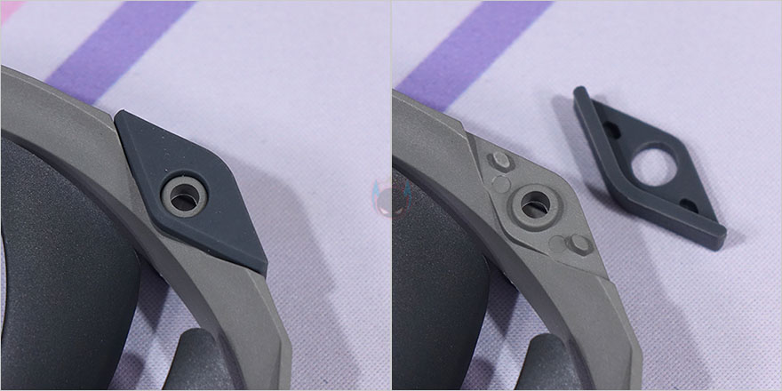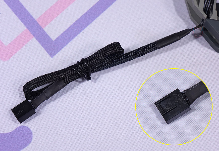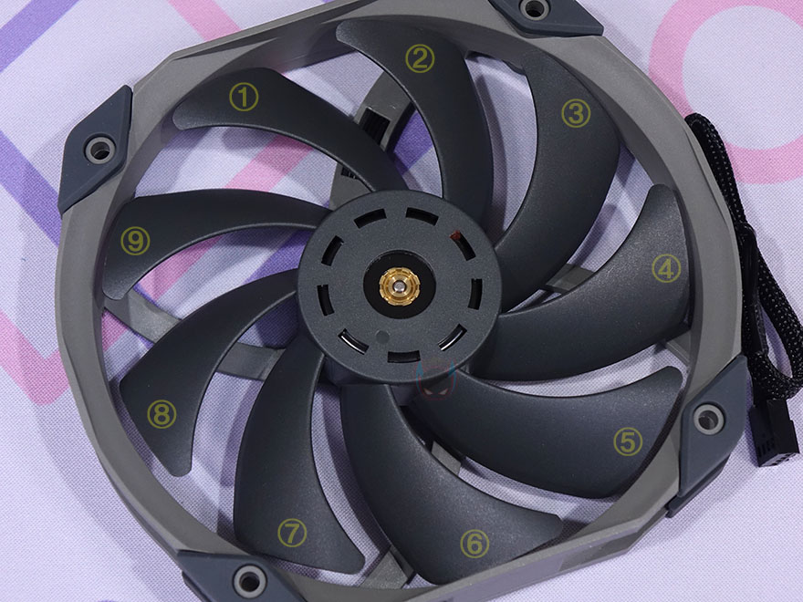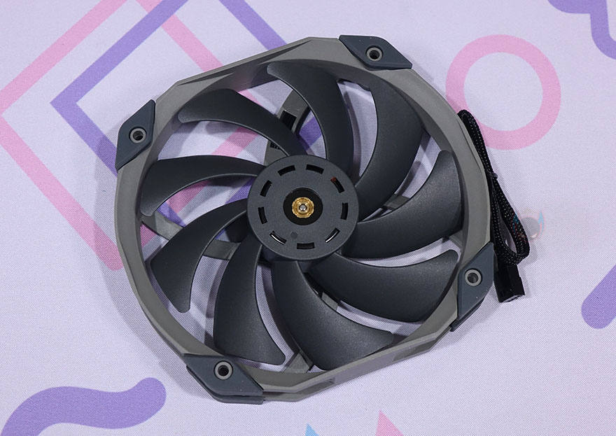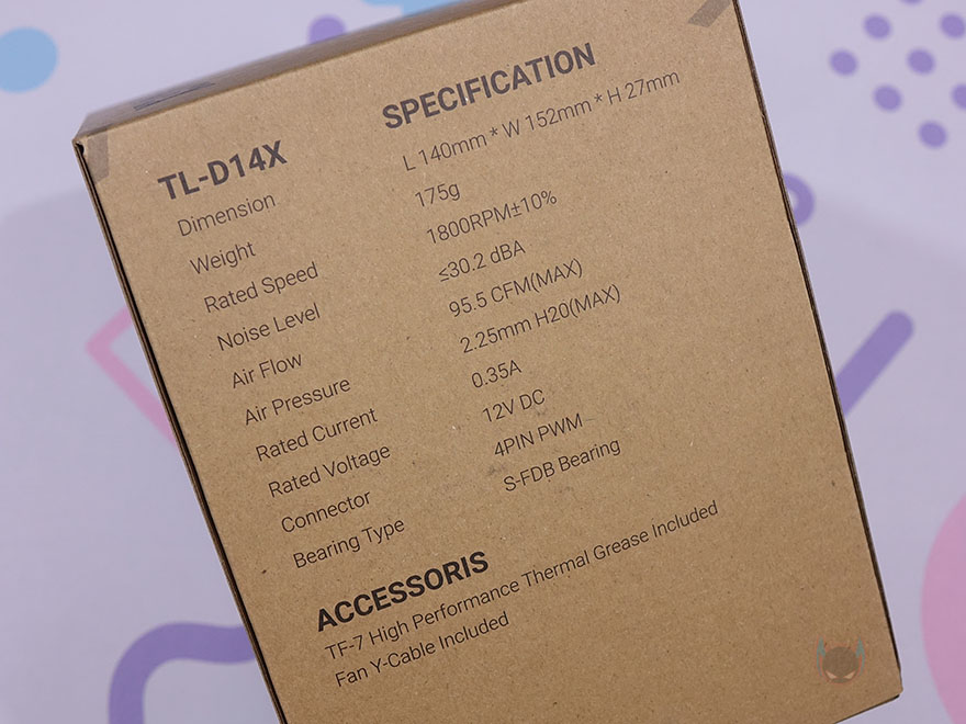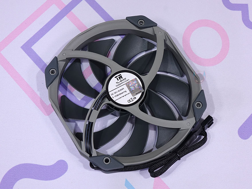 TA140 EX 쿨러에 기본 제공되는 TL-D14X 팬은 별도로도 판매되는 시스템 팬으로 총 9개의 날개(Blade)를 가지고 있으며, S-FDB 베어링으로 속도대비 소음이 낮도록 했습니다. 물론, 팬 나사홀 주변으로는 진동 소음을 줄이도록 분리형 방진 패드가 장착되어 있죠. 팬 케이블은 전체 슬리빙 처리를 해놨으며, 연결방식은 4pin PWM이고, 팬 속도는 최대 1800(±10%) RPM까지 작동합니다.