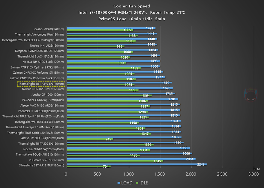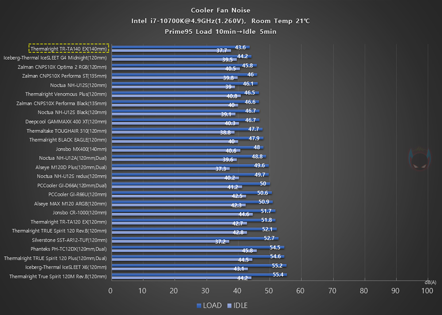 끝으로, 2차(4.9GHz) 오버클럭 상황에서도 CPU의 온도와 전원부의 쿨링효과, 그리고 10cm 거리를 두고 팬 소음과 속도를 확인해 봤는데, CPU 온도는 역시 2차에서도 비교 모델들 중 가장 낮은 온도를 보여주면서 최고 성능을 자랑했습니다. 그리고, 전원부의 쿨링효과 역시 1차 때보다 2차에서 전체 비교 모델들 중 가장 낮은 온도를 보여줘서 높은 오버클럭일수록 TA140 EX 쿨러의 전체적인 성능이 돋보인다라는 것을 짐작할 수 있습니다. 또한, Load와 Idle 상황에서 각각 팬 소음을 측정한 결과 역시 가장 낮은 소음대를 보여줬는데, 속도를 확인해 보면 전체 비교모델들 중 중간급으로 속도대비 팬 소음이 낮은 편이라는 것을 알 수 있습니다.