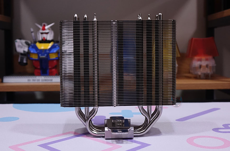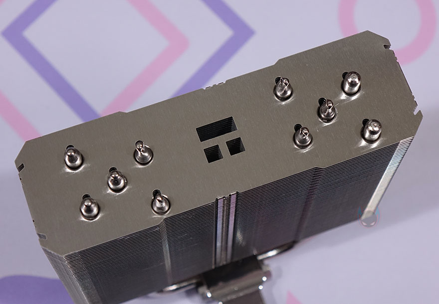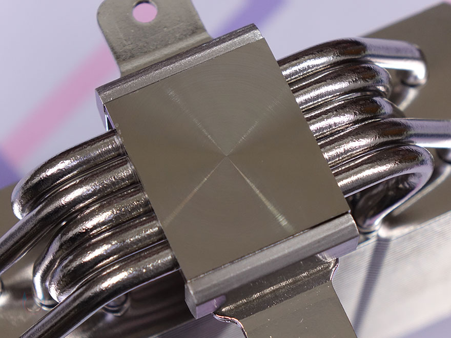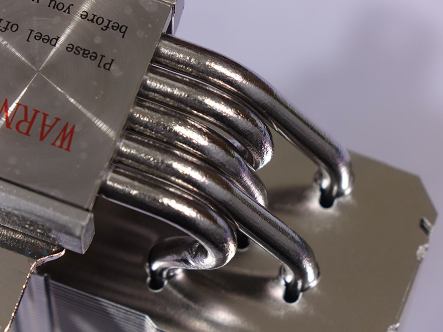 히트파이프(Heatpipe)는 지름 6mm로 5개가 적용되었으며, TA140 EX가 타워형 쿨러이기 때문에 U자 구조로 히트파이프가 방열핀을 관통하며, 관통처리는 솔더링방식입니다. 그리고, CPU와 맞닿는 베이스 부분 역시 니켈 도금처리로 개봉 시에는 보호비닐이 부착되어 있기 때문에, 사용 전에 제거해야 합니다. 물론, 베이스는 매끄럽게 잘 처리되어 있죠.