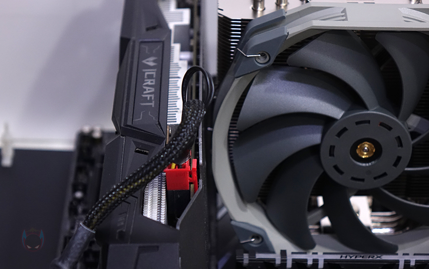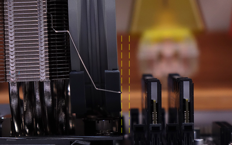 직접 써멀라이트(Thermalright) TA140 EX CPU쿨러를 사용해 보는데, 먼저 장착 같은 경우에는 기존의 써멀라이트 제품을 써 본 소비자라면 크게 바뀐 것이 없기 때문에 어려움이 없으며, 초보자 역시 설명서를 참고하면 어렵지 않게 장착할 수 있습니다. 리뷰에선 부품이 가장 많이 사용되는 인텔 LGA 115x 소켓 기준으로 설명해 보면, 먼저 백플레이트를 메인보드 후면에서 끼운 후 제공되는 와셔를 올려주고, 그 위에 인텔용 브라켓을 올려줍니다. 그리고, 너트로 체결을 해 준 다음, 쿨러를 올려서 브라켓과 체결해 주는 볼트를 사용하면 히트싱크 장착이 마무리되죠. 최종적으로 팬 클립까지 사용해 팬을 장착해 주면 쿨러 장착이 마무리됩니다. 장착 후, 메모리 슬롯과의 간섭을 확인해 보면, 시작에서 언급했듯이 TA120 EX 모델처럼 슬림형이기 때문에 140mm 팬을 장착하고도 메모리 슬롯과 간섭이 없는 것을 확인할 수 있죠. 물론, 140mm 팬이 장착되었기 때문에 1번 PCI슬롯에 그래픽카드가 장착되었다면 거의 맞닿는 수준이라 메인보드 제조사에 따라서 간섭이 발생할 수 있겠습니다.