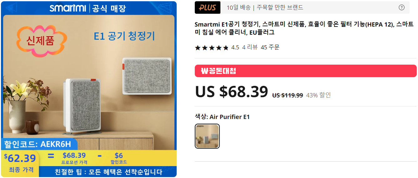 일반적으로 공기청정기는 원통형으로 바닥에 놓고 사용해야한다. 그만큼 자리차리도한다. 그래서, 방에서 사용하기에는 공간낭비가 있는데, 이럴 때 벽걸이 공기청정기 스마트미 E1을 추천한다. 벽걸이부터 바닥, 책상에 놓고 사용할 수 있는 딱 1인실 규모의 공기청정기로 3단계 속도조절과 전용 어플 및 구글 어시스턴트까지 완벽 지원해준다. 역시 피스커뮤에서도 리뷰로 소개했던 제품이니 구입 전 참고하면 좋다. 꽁돈대첩 상품이라 5일안에 무료배송!