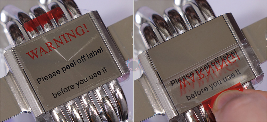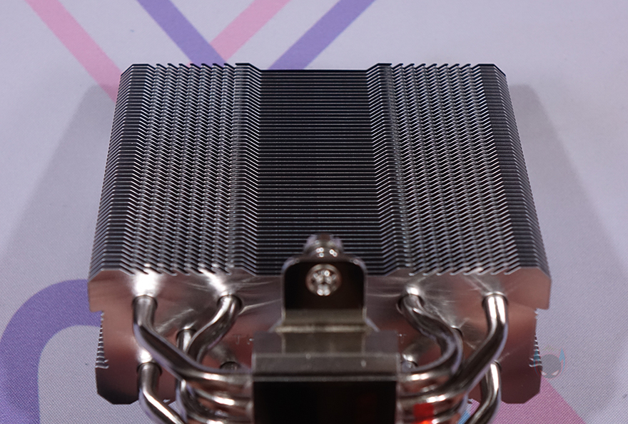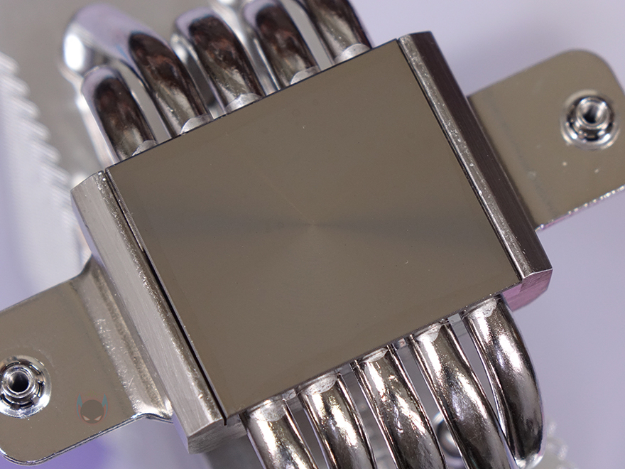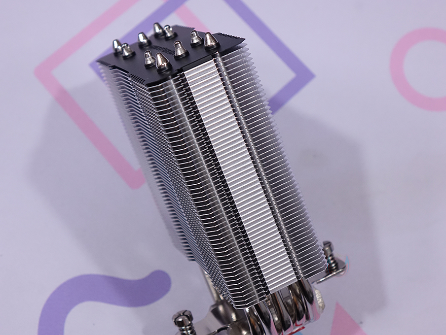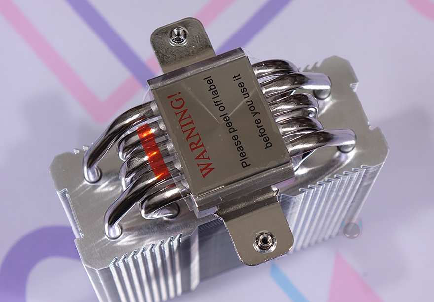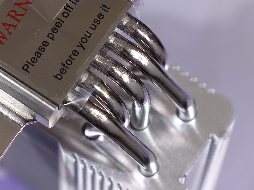 히트파이프(Heatpipe)는 지름 6mm로 총 5개가 사용되었으며, 방열핀을 통과하는 방식은 수작업의 관통식입니다. 그리고, CPU와 맞닿는 베이스 부분은 개봉 시 보호비닐이 부착되어 있으며, 사용 전에 제거를 해야 하며, 베이스 표면은 매끄럽게 래핑처리가 되어있습니다.