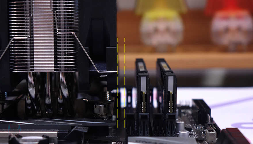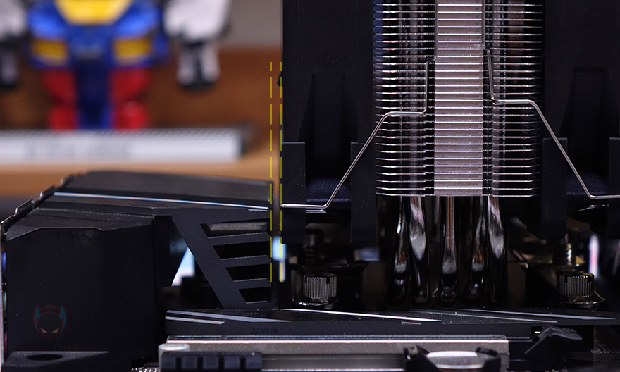 듀얼 팬까지 장착한 후에, 간섭여부를 확인해 보면 메모리슬롯은 가장 가까운 1번과 팬 사이에 공간이 충분히 있을 만큼 간섭이 없으며, 후면에 장착된 팬 역시 메인보드 히트싱크와 여유공간이 남아서 간섭이 없습니다. 물론, 메인보드 히트싱크는 제조사들마다 차이가 있지만, 리뷰에 사용된 메인보드 역시 꽤 큰 편에 속하는 히트싱크이기 때문에, 사실상 웬만한 메인보드에선 간섭 문제가 없다고 보면 되겠습니다.