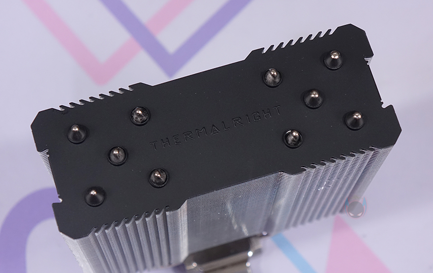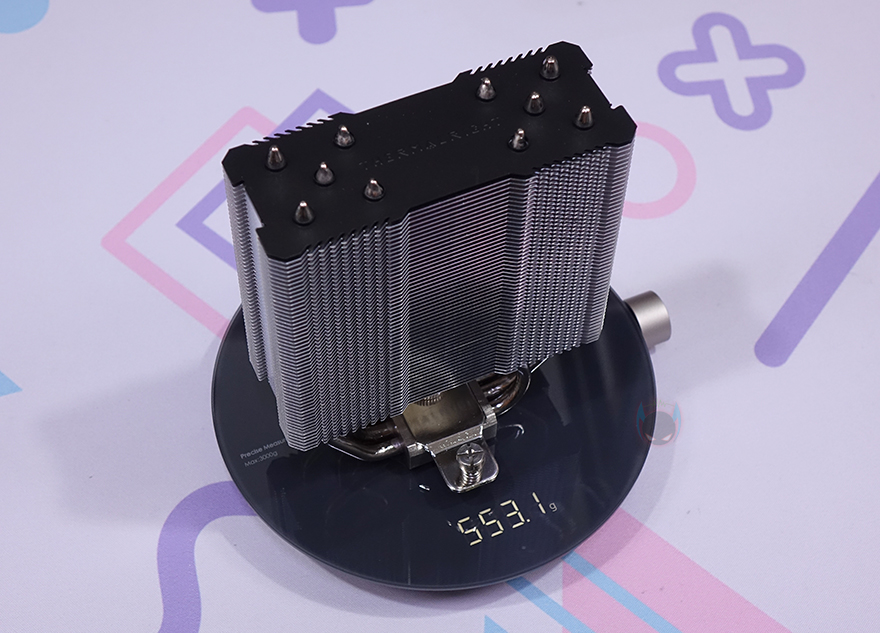써멀라이트(Thermalright) Assassin King 120 Plus CPU쿨러를 살펴보면, 먼저 히트싱크(Heatsink) 같은경우 방열핀과 히트파이프 모두 니켈(nickel) 도금처리가 적용되어 있으며, 무게는 약 553g으로 방열핀은 총 56개 사용되었으며, 120mm 팬이 장착되기 때문에 폭도 120mm를 유지하고 있습니다. 또한, 방열핀 디자인도 일정 패턴으로 적용되어 있으며, 측면에서 보면 깊이가 46mm로 슬림한 형태라는 것을 확인할 수 있죠. 그리고, 맨 위에 방열핀은 블랙색상으로 처리되어 있으며, 써멀라이트 문구를 양각으로 처리해 놨습니다.