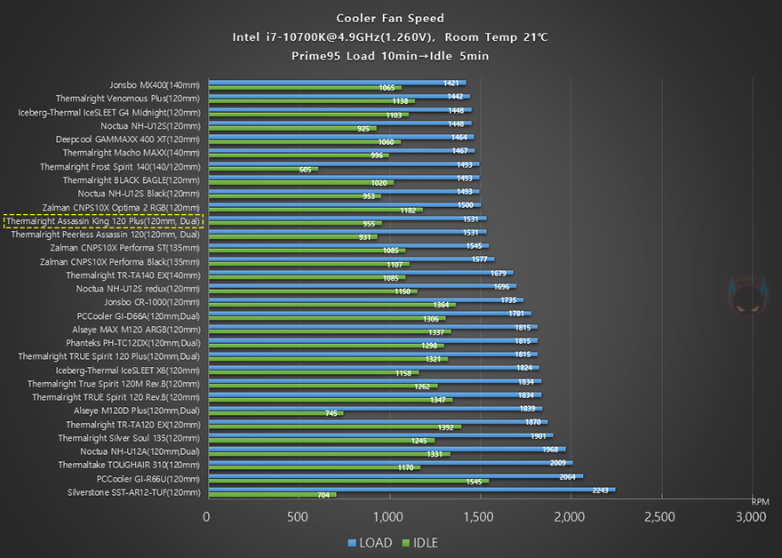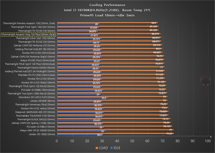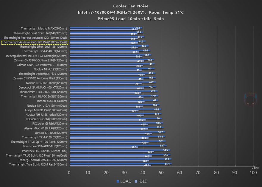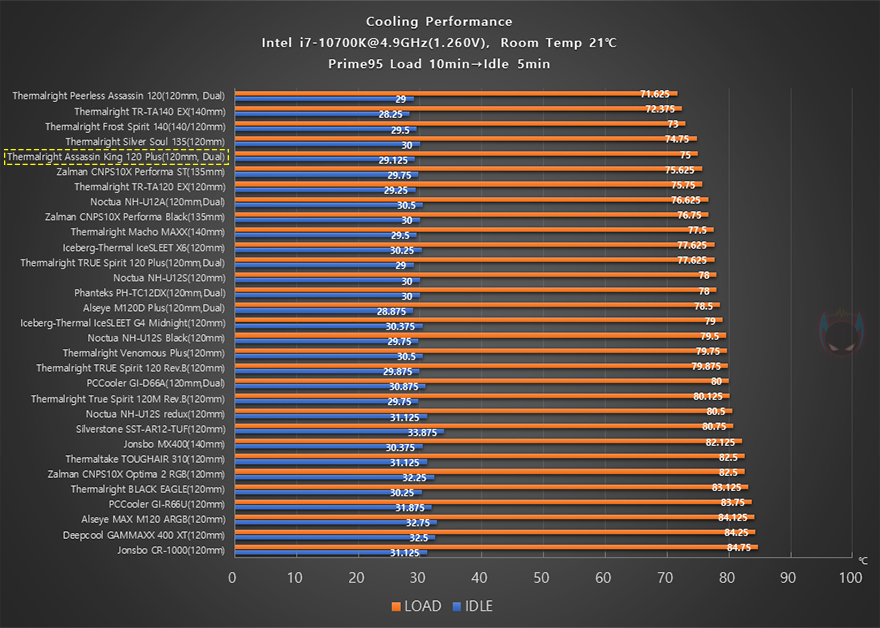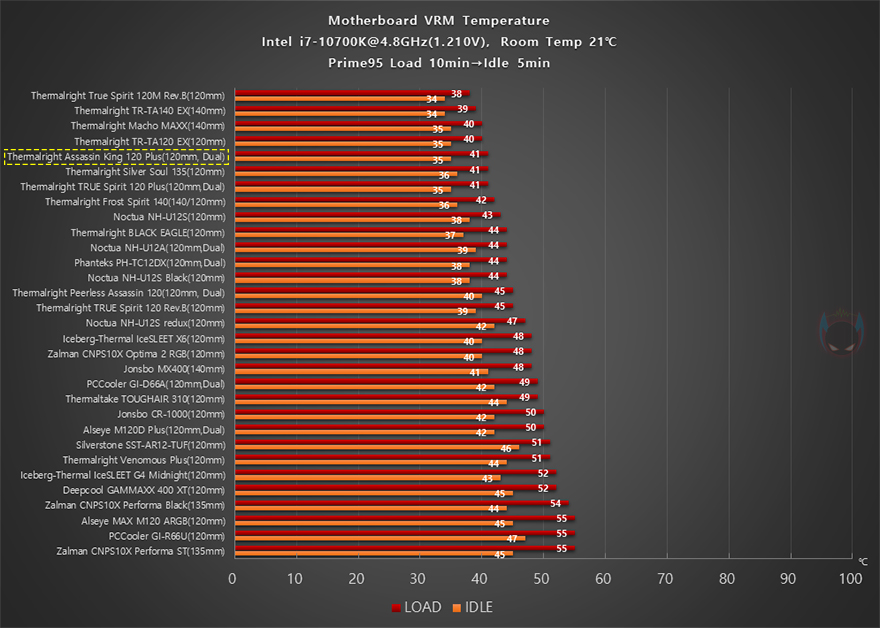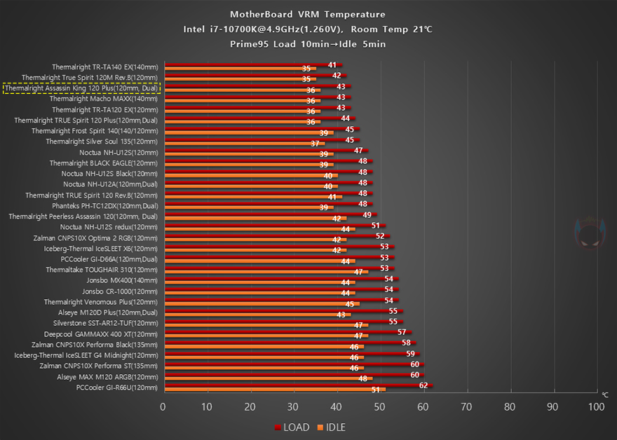 이제 써멀라이트(Thermalright) Assassin King 120 Plus CPU쿨러의 성능을 확인해 보는데, 인텔 i7-10700K CPU를 1차(4.8GHz)와 2차(4.9GHz) 오버클럭으로 나누어 Prime95 프로그램을 통해 100% 과부하 Load 상황 10분과 5분간 대기모드의 Idle 상황에서 각각 CPU 온도와 메인보드 전원부 쿨링효과, 그리고 2차에서 팬 소음 및 속도를 측정해 전체 비교 쿨러들과 비교를 해봤습니다. 먼저, 4.8GHz의 1차 오버클럭에선 듀얼-팬 구성답게 전체 쿨러들 중 4번째로 낮은 CPU 온도를 보여주면서 높은 쿨링성능을 자랑했으며, 메인보드 전원부 쿨링효과 역시 상위권으로 듀얼-팬의 효과를 톡톡히 보여주는 모습입니다.