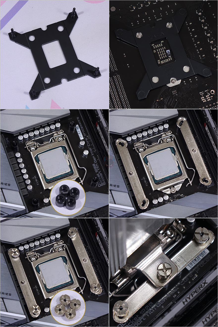 그럼, 써멀라이트(Thermalright) Assassin King 120 Plus CPU쿨러를 사용해 보는데, 먼저 장착 같은 경우에는 이미 써멀라이트 제품을 사용해 본 소비자라면 익숙하며, 초보자도 설명서를 참고하면 어렵지 않게 장착할 수 있을 만큼 쉬운 편입니다. 리뷰에선 부속품이 가장 많이 사용되는 인텔 LGA 115x/1200 소켓 기준으로 설명하는데, 일단 인텔용 백플레이트를 메인보드 후면에서 끼운 후, 스탠드오프를 올려주고, 그 위에 인텔용 브라켓을 올려줍니다. 그리고, 브라켓 너트로 고정시킨 다음, 히트싱크를 올려서 히트싱크에 있는 마운트와 브라켓을 체결해 주면 히트싱크 장착은 끝나고, 마무리로 팬 클립을 사용해 팬까지 장착해 주면 되죠.