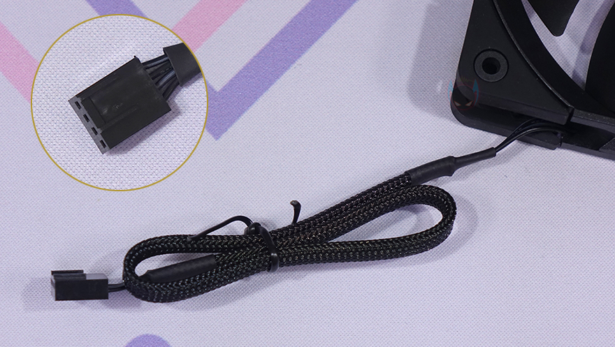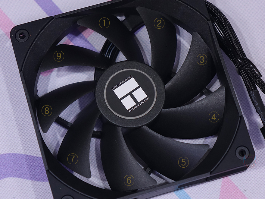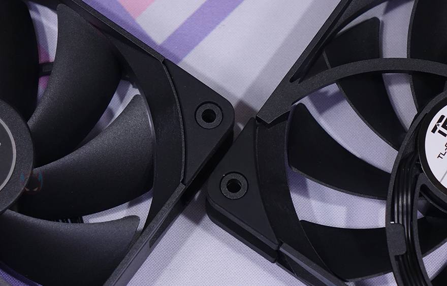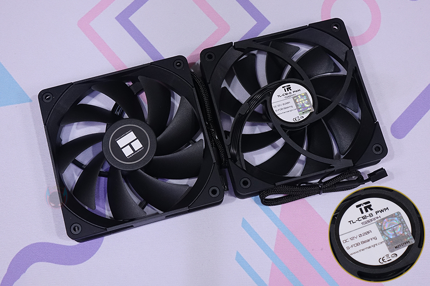 기본 제공되는 2개의 120mm 팬은 모두 TL-C12B 모델로 기본 모델인 TL-C12의 블랙색상 버전이라고 보면 됩니다. 팬 프레임부터 날개, 그리고 진동방진 패드까지 올-블랙 색상으로 처리되어 있죠. 팬 날개(Blade)는 총 9개이며, S-FDB 베어링으로 최대 1500(±10%) RPM 속도로 작동하며, 팬 케이블은 전체 슬리빙 처리에 연결방식은 4pin PWM입니다.