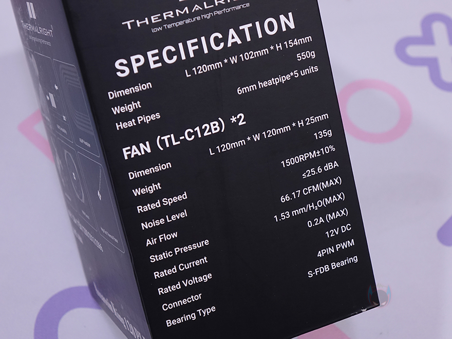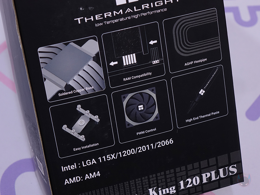 제품박스부터 살펴보면, 일반적으로 써멀라이트 제품들은 박스에 디자인 그러니깐 정확히는 컬러풀한 디자인을 잘 적용하지 않죠. 하지만, Assassin King 120 Plus 모델은 블랙색상 배경으로 컬러 디자인을 적용하고 있습니다. 전면에 담긴 제품 이미지도 실물 색상 그대로 담고 있죠. 박스 한쪽 측면에는 제품의 기본 사양을 표기해놨는데, 쿨러 높이, 히트파이프, 팬 사양을 확인할 수 있으며, 후면에는 제품의 주요 특징으로 구리 베이스, 메모리 간섭 해결, AGHP 히트파이프, 쉬운 설치, PWM 팬, 고성능 써멀그리스를 표기해 놨습니다. 또한, 박스 개봉 부분에는 동봉-씰(seal)도 적용되어 있죠.
