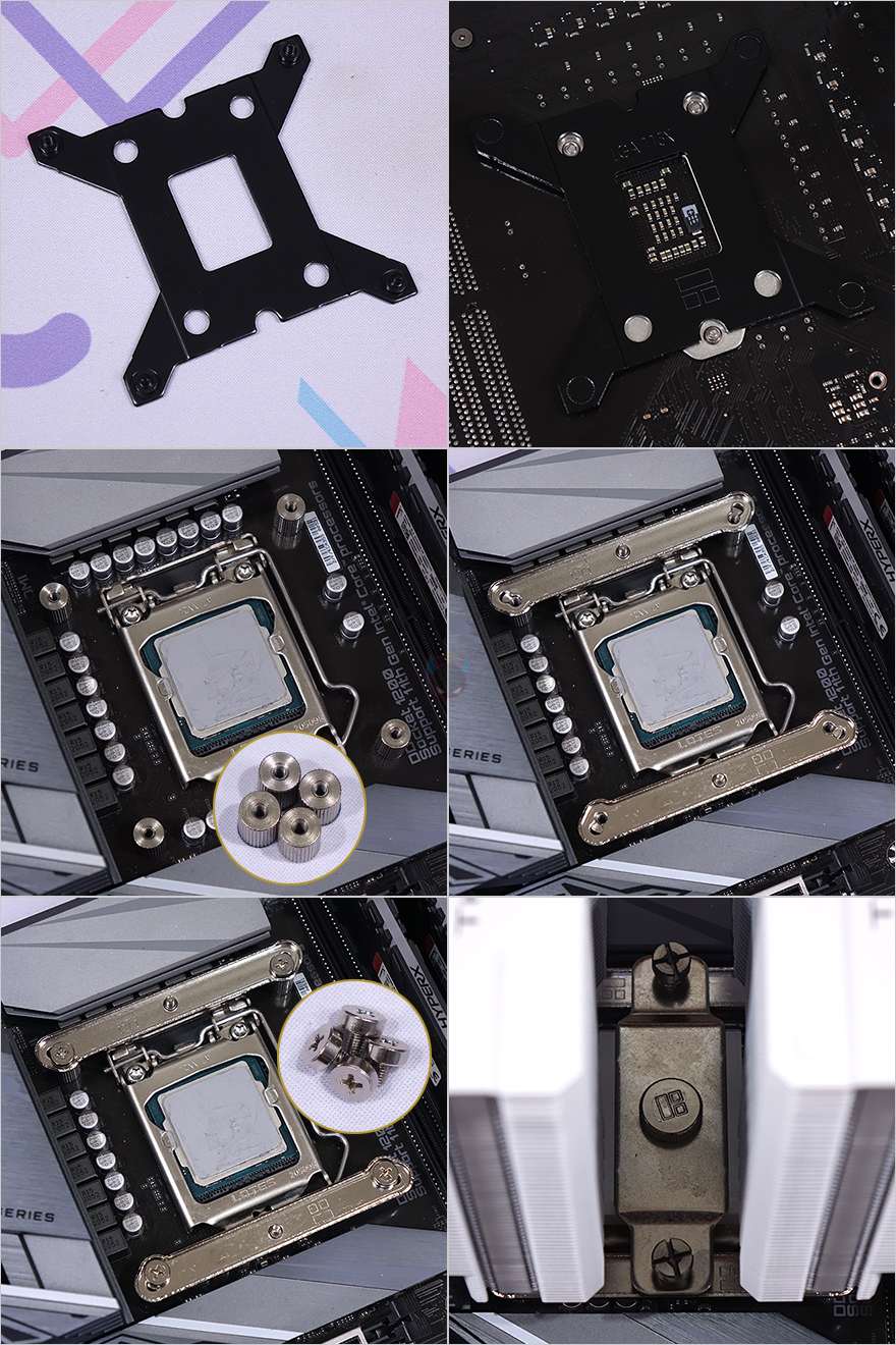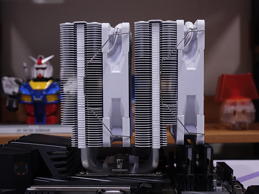 그럼, 써멀라이트(Thermalright)의 Peerless Assassin 120 White CPU쿨러를 직접 사용해보는데, 장착은 기존 Peerless Assassin 120 모델과 동일하며, 리뷰에선 부속품이 많이 사용되는 인텔 LGA 115x/1200 소켓 기준으로 설명하는데, 먼저 인텔용 백플레이트를 메인보드 후면에서 끼운 후, 더블-볼트를 사용해 고정해 줍니다. 그리고, 그 위에 인텔용 브라켓을 올려주고, 브라켓 너트로 고정시킨 다음, 히트싱크(Heatsink)를 올려서 히트싱크의 마운트와 브라켓을 체결해 준 다음, 마무리로 팬 클립을 사용해 팬을 장착해 주면 되죠. 앞시간에 Peerless Assassin 120 모델에서도 언급했듯이 쿨러 측면에서 보면 앞부분의 팬은 메모리 슬롯 영역을 침범하지만 메모리 방열판 윗부분에 장착되기 때문에 간섭이 최소화되며, 히트싱크 사이에 장착되는 가운데 팬은 경우에 따라서 상하 위치조절을 통해 메인보드 전원부 쿨링효과를 어느 정도 개선할 수 있습니다. 일단, 리뷰에선 기존 Peerless Assassin 120과 동일하게 앞부분의 팬과 동일한 위치로 잡았습니다.