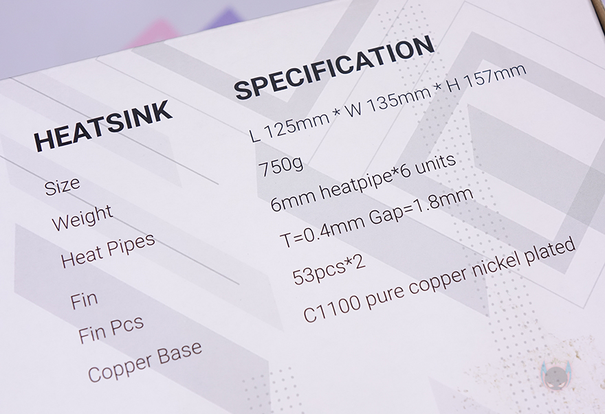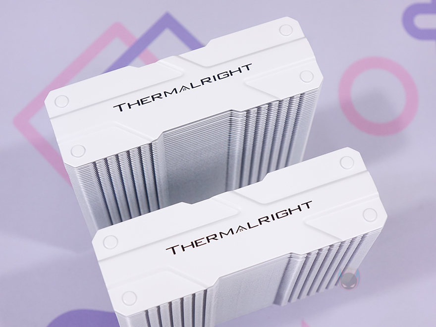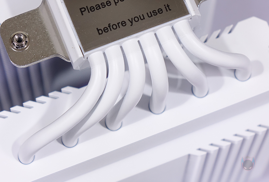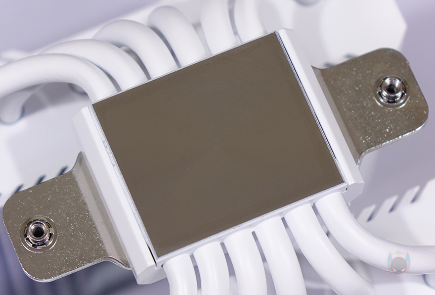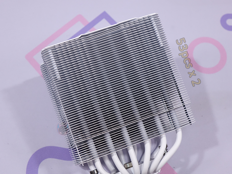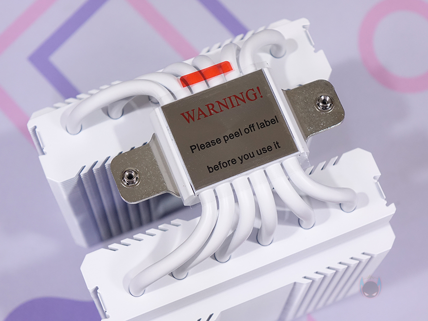 방열핀은 기존 모델과 동일하게 53개씩 앞뒤로 나뉘어서 총 106개가 적용되었으며, 맨 위 방열핀 그러니깐 커버부분도 화이트 색상으로 처리했습니다. 또한, 히트파이프(Heatpipe) 역시 지름 6mm로 총 6개가 사용되었는데, 모두 화이트색상으로 도색처리되었죠. 유일하게 도색이 되지 않은 부분은 마운트, 그리고 CPU와 맞닿는 베이스 부분으로 베이스에는 개봉 시 보호비닐이 부착되어 있기 때문에 사용 전에 제거를 해야 하며, 표면은 매끄럽고 깔끔하게 래핑처리되어 있습니다. 색상을 제외하고는 기존 Peerless Assassin 120 모델과 모두 동일합니다.