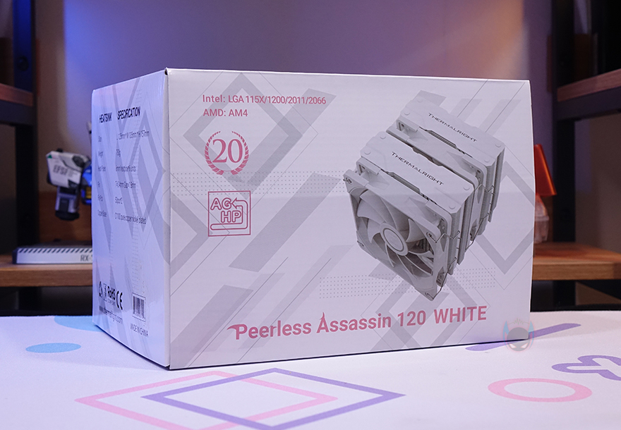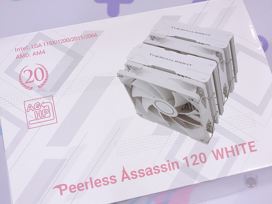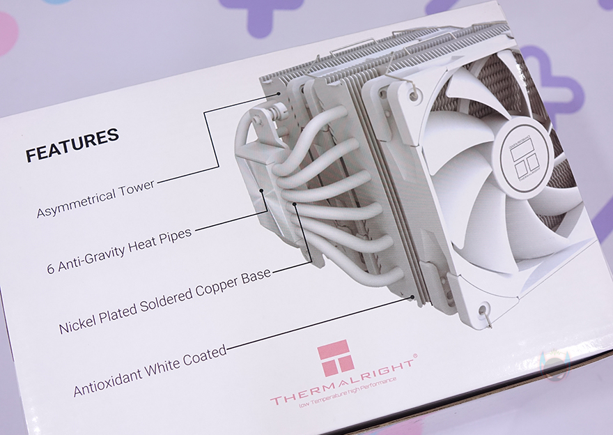 제품박스부터 살펴보면, 화이트컨셉답게 박스디자인을 화이트색상으로 적용하고 있습니다. 기존 Peerless Assassin 120 모델은 그냥 박스재질 색상 그대로였죠. 좀 더 살펴보면, 박스 상단에 모델명과 제품 로고도 핑크색상으로 표기해 놨으며, 전면에 제품 이미지도 컬러 이미지 그대로 담고 있으며, 소켓 지원 등도 확인할 수 있습니다. 또한, 박스 양쪽 측면에는 히트싱크(Heatsink)와 팬(Fan) 사양을 상세하게 표기해 놨는데, 이미 앞시간에서 Peerless Assassin 120를 만나봤기 때문에, 사양이 동일하다는 것을 눈치챌 수 있죠. 하지만, 박스 후면의 제품 주요 특징 표기는 조금 다릅니다. 기존 6개 히트파이프와 니켈 도금 표기를 그대로이고, 추가로 화이트 도색과 비대칭 타워라는 표기를 해놨습니다.