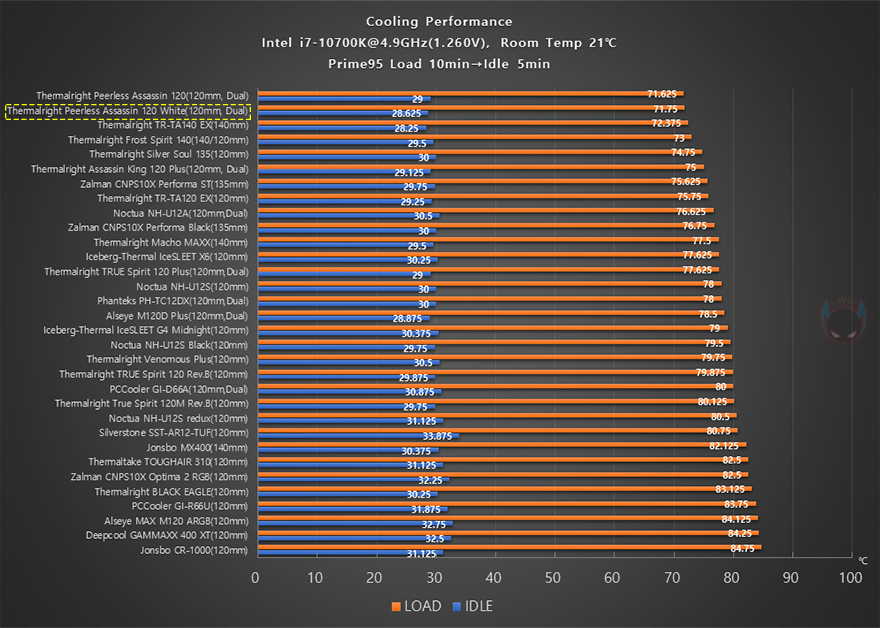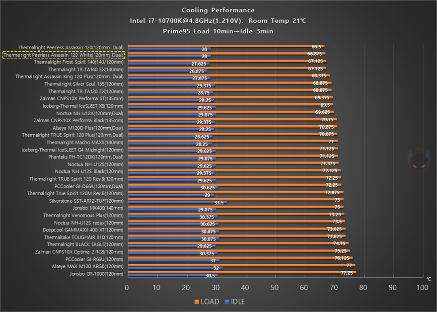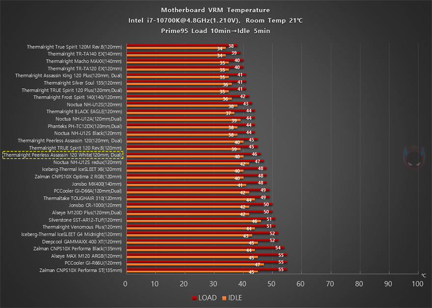 이제 써멀라이트 Peerless Assassin 120 White CPU쿨러의 성능을 확인해보는데, 인텔 i7-10700K CPU를 1차(4.8GHz)와 2차(4.9GHz) 오버클럭으로 나누어서 Prime95 프로그램을 통해 100% 과부하 Load 10분 상황과 5분간 Idle 상황에서 CPU 온도, 메인보드 전원부 쿨링효과, 그리고 2차에서 팬 소음과 속도를 측정해 전체 쿨러들과 비교해 봤습니다. 먼저, 1차 오버클럭에선 기존 Peerless Assassin 120 모델과 0.5℃내로 역시 전체 쿨러들 중 최상위 수준으로 낮은 온도를 보여줬으며, 메인보드 전원부 쿨링효과 역시 기존 모델과 1℃내로 비슷한 수준임을 확인할 수 있습니다.