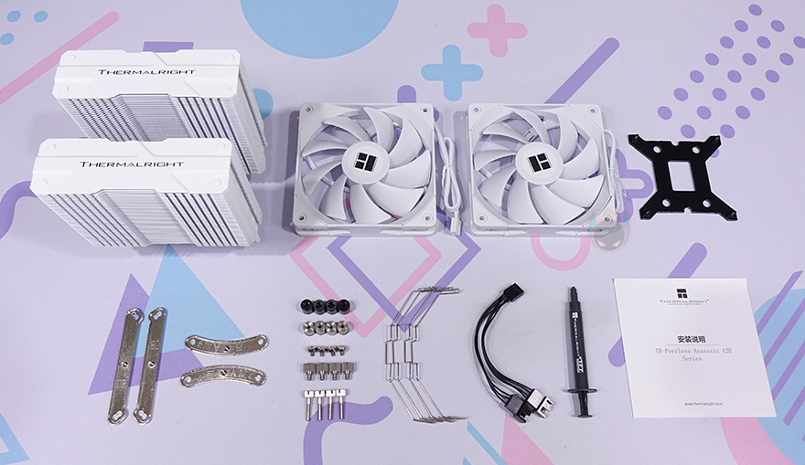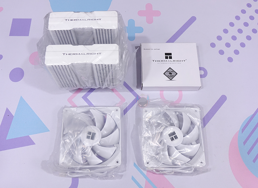 박스를 열어보면, 포장은 기존 Peerless Assassin 120 모델과 동일하게 외부 충격방지를 위해 우레탄-폼 포장재를 사용하면서, 히트싱크와 팬은 기본 비닐포장, 부속품들은 별도의 박스 포장을 했습니다. 제품구성 역시 기본 모델과 동일하게 Peerless Assassin 120 White 히트싱크, TL-C12W 120mm 팬 2개, 인텔 LGA 115x/1200용 백플레이트, 인텔용 브라켓, AMD용 브라켓, 스탠드오프, 더블-볼트, 브라켓 너트, 인텔 LGA 20xx용 나사, AMD용 나사, 팬 클립, Y자 연장 팬-케이블, TF7 써멀그리스, 제품설명서로 이루어져 있습니다.