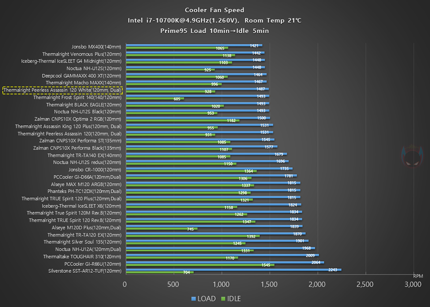2차 오버클럭 역시 Peerless Assassin 120 White CPU쿨러의 쿨링성능은 기존 Peerless Assassin 120와 0.5℃내로 차이가 없는 수준으로 최상위 성능을 보여줬으며, 메인보드 전원부 쿨링효과 역시 기존 모델과 1℃내로 차이가 거의 없는 수준입니다. 쉽게 말해, 기존 Peerless Assassin 120 모델에 화이트색상 도색이 추가되었지만, 성능차이는 크게 변하지 않았다라는거죠. 일반적으로 공랭쿨러에선 도색이 추가되면 성능이 하락하는 경우가 있는데, Peerless Assassin 120 White는 거의 하락이 없는 수준이라고 보면 됩니다. 그리고, 2차에서 팬 소음과 속도를 확인해 봐도 역시 기존 모델처럼 속도대비 낮은 소음대라는 것도 그대로 유지해주고 있죠.