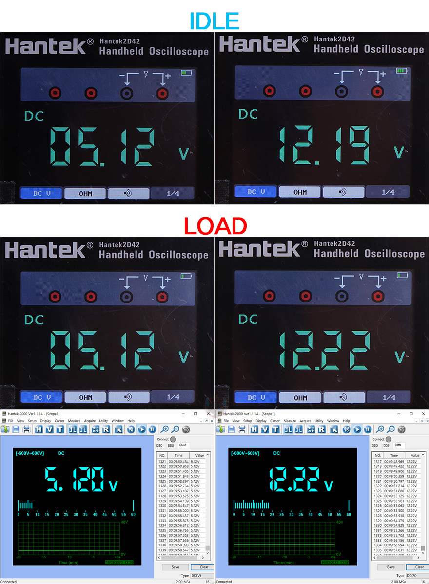 이제, 직접 마이크로닉스 WIZMAX SILVER 파워서플라이를 사용해 보는데, 그전에 전체 전압들의 기본 출력상태를 확인해 보면, 인텔 파워서플라이 가이드라인 표준범위에서 안정적으로 출력되는 것을 확인할 수 있죠. 그리고, 이제 OCCT 프로그램을 통해 5V와 12V의 전압을 과부하(Load) 상태일 때와 Idle 상태일 때 각각 변동폭을 확인해 보면, 5V는 Idle과 Load 상황 모두 동일한 전압으로 흔히 말하는 칼전압 수준을 보여줬으며, 12V 같은 경우에는 Idle에선 고정이고, Load에선 약 0.01V 수준으로 Idle과 Load 전체 변동폭도 0.04V 수준으로 매우 낮은 편임을 확인할 수 있어서, 출력상태가 안정적이라는 것을 확인할 수 있습니다.