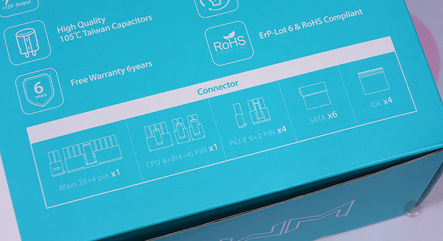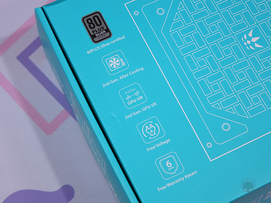 제품박스부터 살펴보면, 작년에 출시했던 WIZMAX 80 Plus Gold등급 제품은 보라색을 배경으로 했는데, 이번 WIZMAX 80 Plus Silver등급 제품은 하늘색을 배경으로 적용하고 있습니다. 배경색을 제외하면 박스 디자인은 큰 차이가 없으며, 전면 오른쪽에 모델명을, 왼쪽에는 주요 특징 5개를 표기해 놨는데, 당연히 80 Plus 등급 표기는 다르고, 나머지 또 하나 Gold와 Silver 등급 제품에 차이가 있는데, 바로 보증기간입니다. 이번 WIZMAX 80Plus Silver등급 제품은 Gold등급보다 1년 짧은 무상 6년을 보증해주고 있죠.