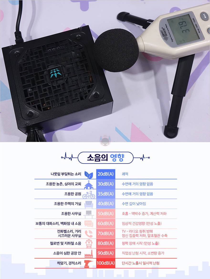 끝으로, WIZMAX SILVER 파워서플라이를 기본 작동상태에서 팬 소음을 근접해서 측정해 봤는데, 앞서 내부에서 확인했듯이 Silver등급에 사용된 120mm 팬은 Gold등급 제품과 같습니다. 그래서, 소음측정값 역시 약 38dB로 상위 모델 WIZMAX Gold 파워서플라이와 동일하며, 정숙한 소음대로 실제 PC케이스에 장착했을 때는 이보다 더 낮게 전달되기 때문에 소음에 대해선 걱정하지 않아도 되겠습니다.