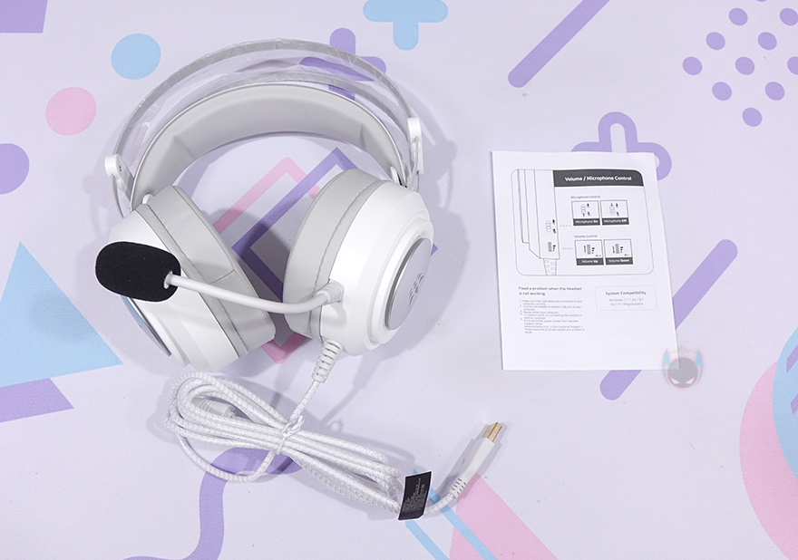 이어-컵 부분은 양쪽 모두 바깥쪽에 마이크로닉스 로고를 새겨놨는데, 뒤에서 확인하겠지만 로고부분과 그레이색상 부분 외곽으로 LED 효과를 적용했습니다. 그리고, 왼쪽 이어-컵에는 마이크가 적용되어 있는데, 다른 게이밍 헤드셋 제품들처럼 자유롭게 구부리며 위치조절할 수 있는 플렉시블 방식이며, 마이크 부분에 주변 소음을 감소시켜 주는 윈드스크린도 기본 장착되어 있습니다. 물론, 마이크에 노이즈 캔슬링도 적용되어 있죠. 그리고, 왼쪽 이어-컵 뒤쪽으로는 볼륨조절 휠과 마이크 On/Off 스위치가 배치되어 있습니다.