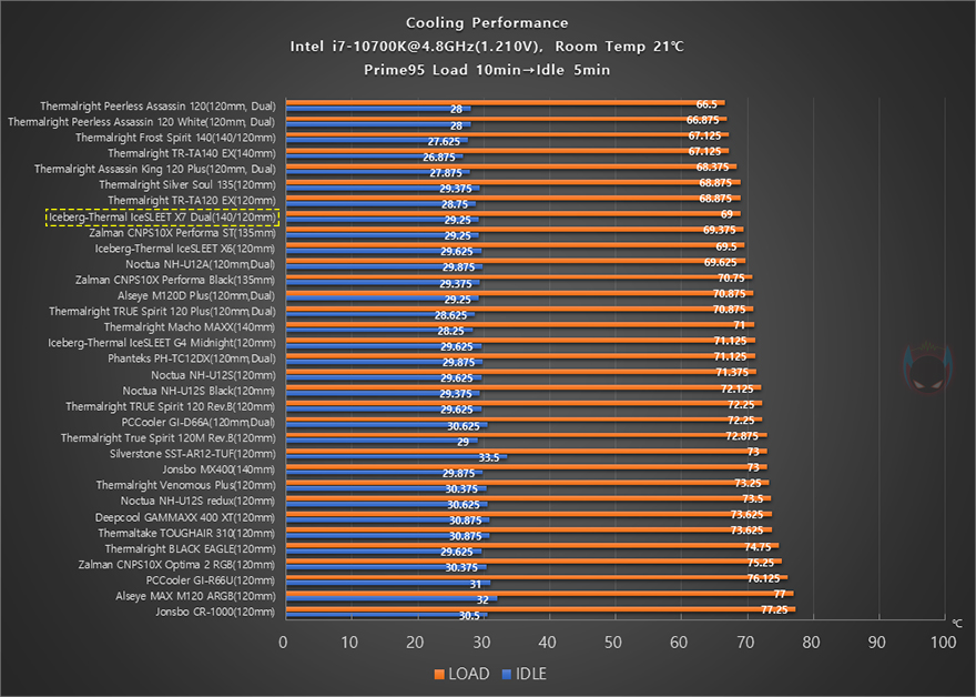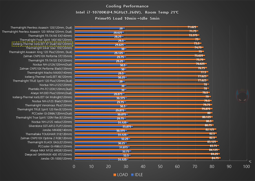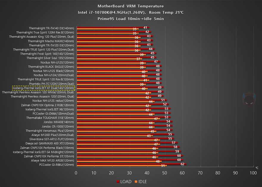 이제 Iceberg-Thermal(아이스베르그-써멀)의 IceSLEET X7 Dual CPU쿨러 성능을 확인해 보는데, 인텔 i7-10700K CPU를 1차(4.8GHz)와 2차(4.9GHz) 오버클럭으로 나누어서 Prime95 프로그램을 통해 100% 과부하 Load 10분과 대기상태의 Idle 5분 상태에서 CPU 온도, 메인보드 전원부 쿨링효과, 2차에서 팬 소음 및 속도를 확인해 다른 쿨러들과 비교해봤습니다. 먼저, 4.8GHz 1차 오버클럭에선 CPU 온도는 상위권으로 메인보드 쿨링효과는 중간권정도의 결과를 보여줬는데, 아무래도 커버가 적용된 디자인 CPU쿨러이기 때문에 트윈 쿨러에 듀얼-팬의 성능이 최대치로 나오기는 좀 힘든 모습을 보여줍니다.