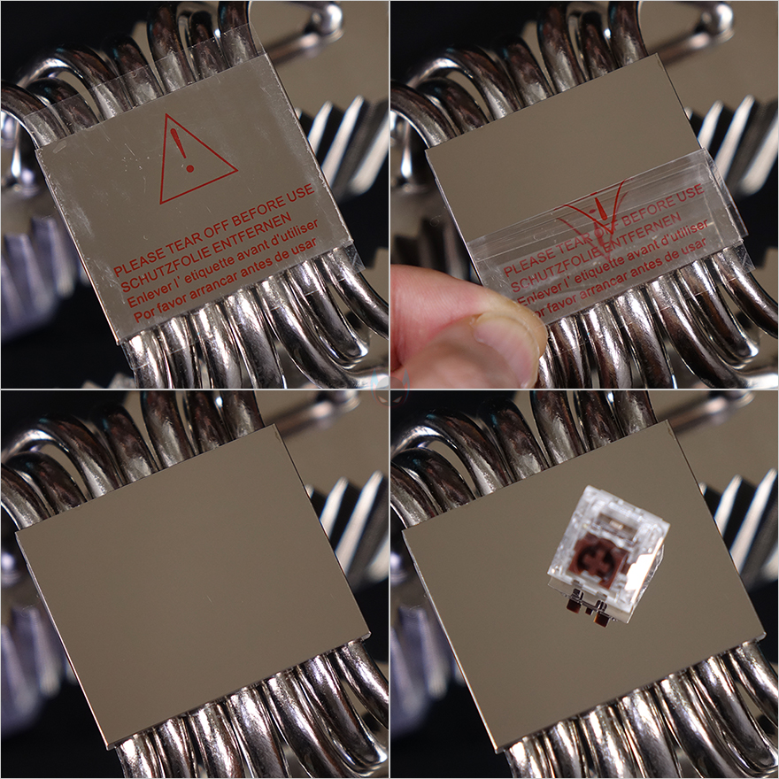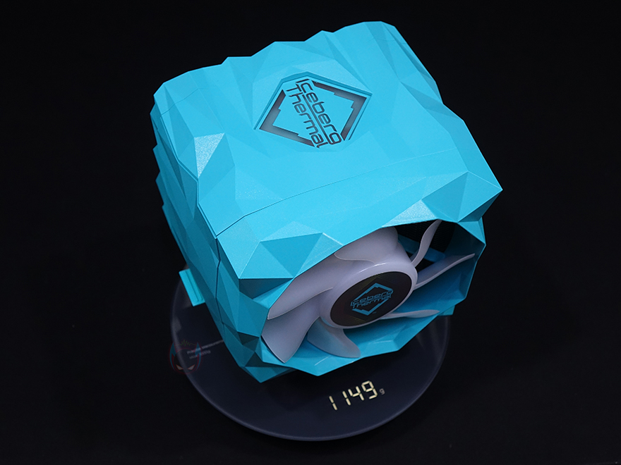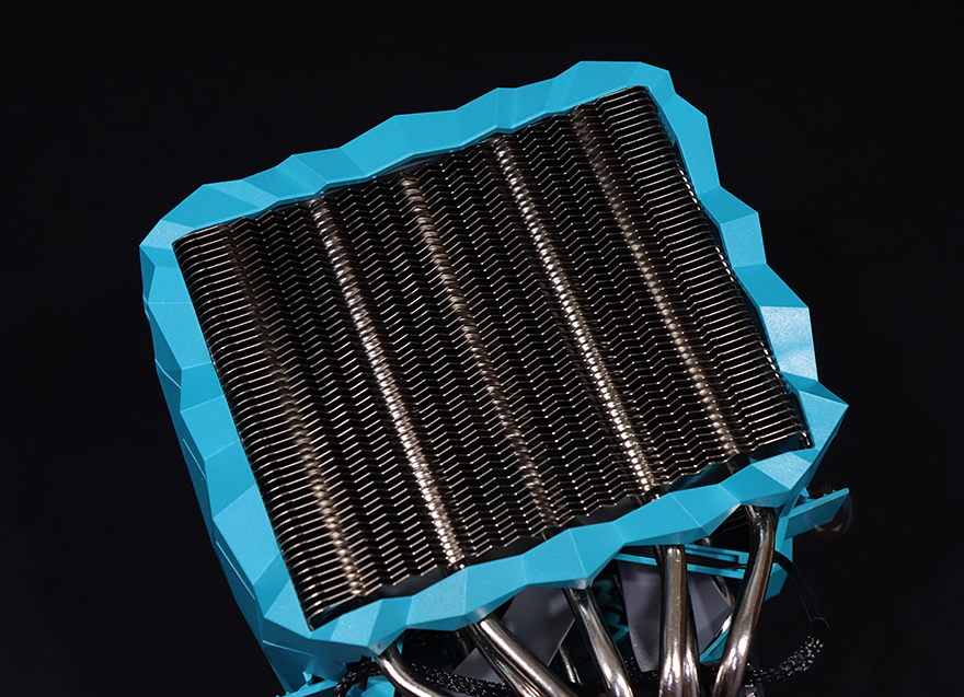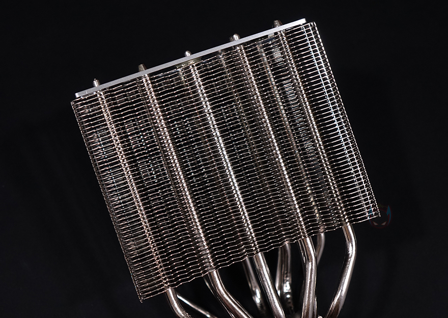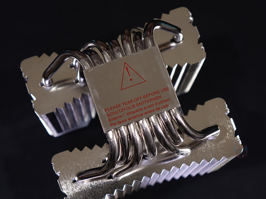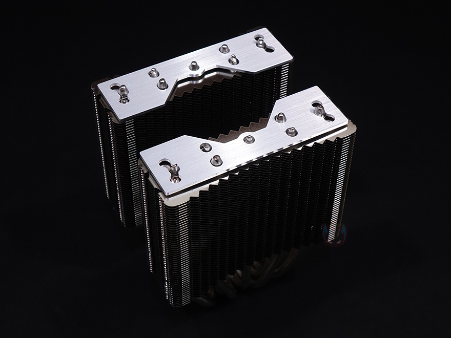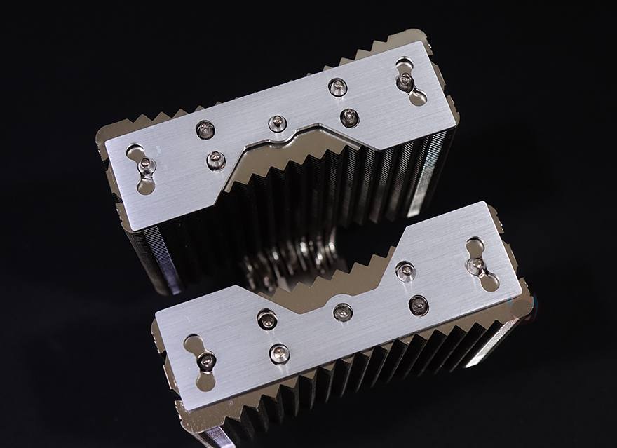 커버를 모두 분리한 상태에서 IceSLEET X7 Dual CPU쿨러의 히트싱크를 살펴보면, 트윈-쿨러 특징인 양쪽으로 방열핀이 나뉜 것을 확인할 수 있으며, 총 98개가 사용되었습니다. 그리고, 방열핀 맨 위에는 따로 한 번 더 마감 커버를 적용하고 있죠. 히트파이프는 지름 6mm로 총 7개가 사용되었으며, 방열핀을 통과하는 방식은 솔더링입니다. 그리고, 히트싱크 전체가 니켈(nickel) 도금으로 처리되어 있어서 CPU베이스 부분 역시 매끄러운데, 개봉 시 보호비닐이 부착되어 있어서, 사용 전에 제거를 해야 하며, 비닐을 제거하면 베이스가 사물이 비칠 정도로 잘 래핑처리된 것을 확인할 수 있죠. 끝으로, 쿨러 전체의 무게는 약 1.15kg입니다.