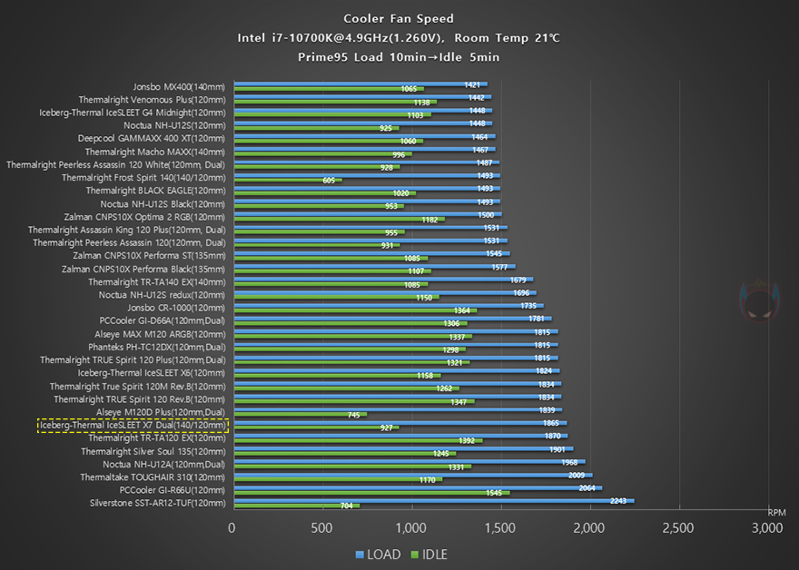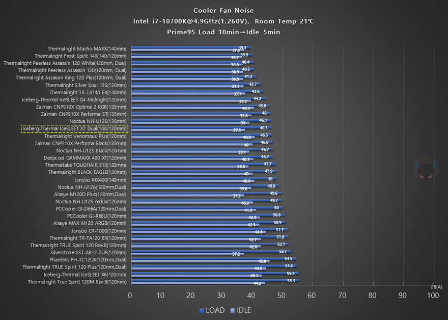 하지만, 4.9GHz의 2차 오버클럭에선 CPU 온도가 1차 때보다 더 좋은 결과를 보여주면서 좀 더 상위권의 성능을 보여주죠. 물론, 메인보드 전원부 쿨링효과는 중간권입니다. 그래서, IceSLEET X7 Dual CPU쿨러는 CPU 클럭이 높을수록 CPU쿨링 성능이 잘 나오지만, 트윈쿨러와 듀얼-팬 구성을 생각하면 역시 일반적인 트윈쿨러보다는 기대치가 조금 낮은 모습을 보여줍니다. 이런 부분은 역시 커버 디자인이 적용되었기 때문이라 할 수 있죠. 물론, 반대로 생각해 보면 CPU쿨러로써는 확실히 차별적인 디자인을 가졌고, 이 부분을 감안하면 나쁘지 않은 쿨링 성능임도 분명합니다. 또한, 2차에서 팬 소음과 속도를 확인해 보면, 속도대비 소음도 낮은 편이라 할 수 있죠.