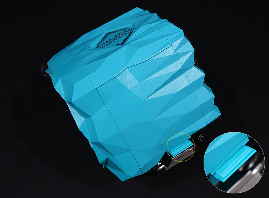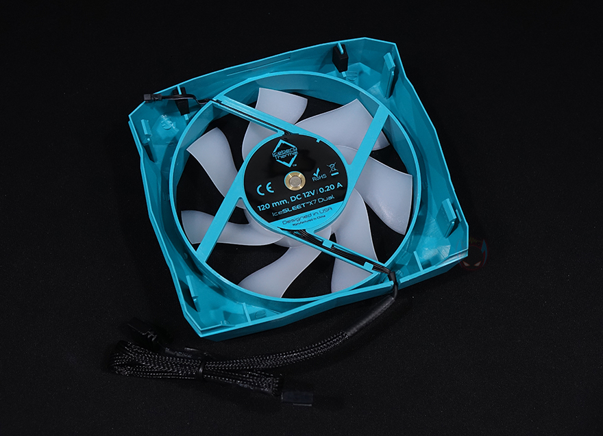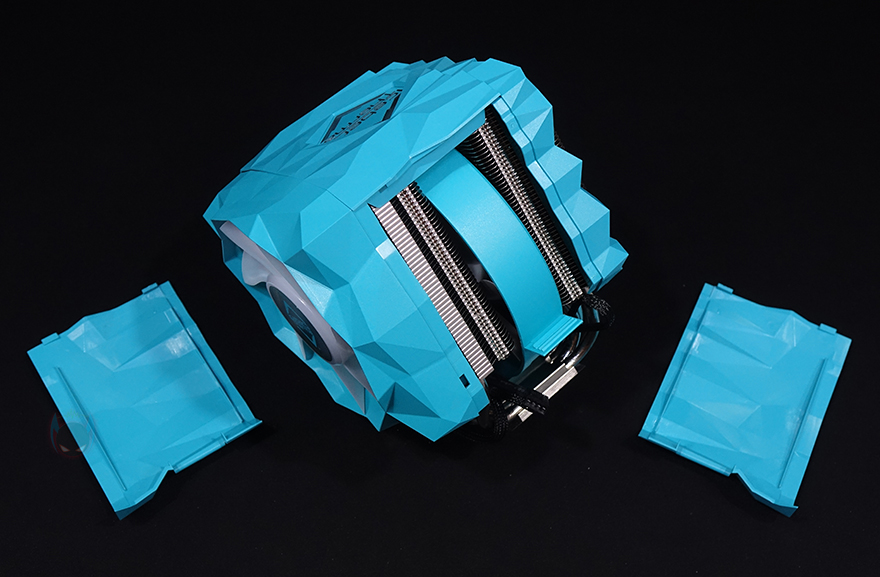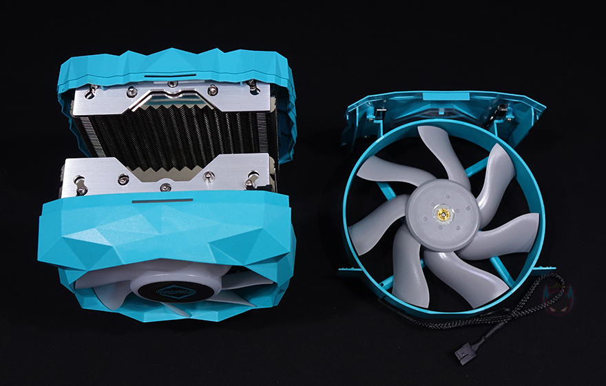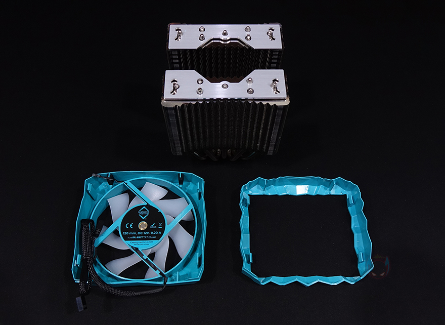IceSLEET X7 Dual CPU쿨러 역시 X6과 마찬가지로 커버 분리가 가능한데, 먼저 측면 양쪽 아래쪽에 위치한 걸쇠 부분을 살짝 벌리면 측면 커버가 분리됩니다. 그리고, IceSLEET X7 Dual이 트윈-쿨러이기 때문에 상단 로고가 새겨진 가운데 부분은 커버인 동시에 140mm 팬이 장착되어 있죠. 그대로 위로 올리면 쉽게 분리가 됩니다. 또한, 140mm 팬 상단 커버 안쪽에는 로고 부분에 ARGB 조명효과를 위해 LED칩과 케이블이 적용되어 있는데, 전면에 장착된 120mm 팬과 연결됩니다. 참고로, 전면에 장착된 120mm 팬은 최대 1850RPM 속도인 반면, 가운데 140mm 팬은 최대 1600RPM 속도를 가졌죠.