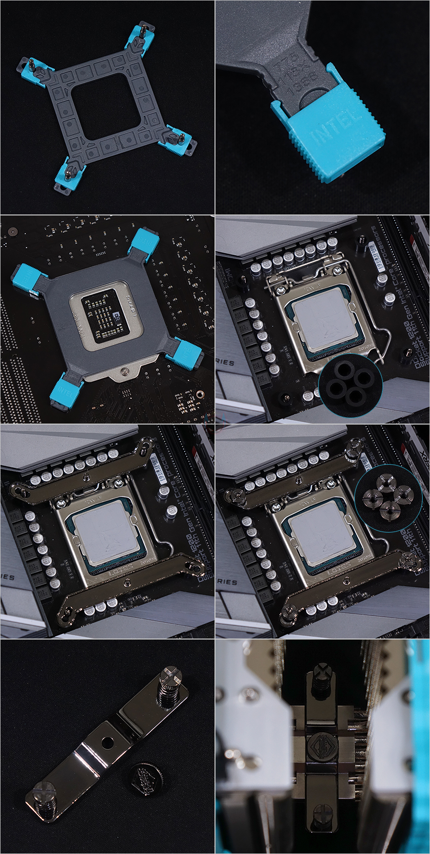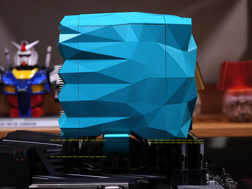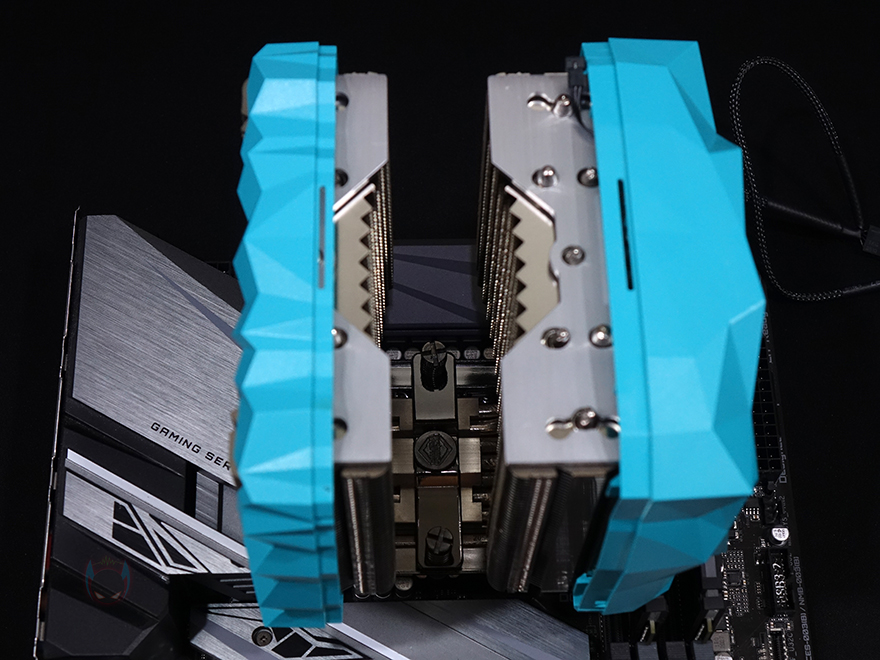 그럼, 직접 Iceberg-Thermal(아이스베르그-써멀) IceSLEET X7 Dual CPU쿨러를 사용해 보는데, 일단 장착은 앞서 만났던 IceSLEET X6과 큰 차이가 없으며, 부품이 가장 많이 사용되는 인텔 소켓으로 설명하자면, 먼저 인텔용 백플레이트를 자신이 사용하는 CPU 소켓에 맞춰 위치조정한 후, 메인보드 후면에서 끼워줍니다. 그리고, 스탠드오프를 그 위에 올려주고, 그다음 인텔용 브라켓을 올리며, 브라켓 너트로 고정해 줍니다. 그리고, 브라켓과 체결되는 마운트를 먼저 히트싱크의 베이스 윗부분에 고정시킨 다음, 그대로 CPU 위에 올려서 브라켓과 마운트를 체결하면 히트싱크 장착이 끝나죠. 마무리로 가운데 140mm 팬을 다시 넣어주고, 양쪽 커버를 다시 닫아주면 장착이 마무리됩니다. 장착 후 측면에서 보면 전면 120mm 팬은 메모리 슬롯 영역을 침범하지만, 장착된 메모리와 간섭이 생기지 않죠. 물론, 높이 제한이 45mm까지이기 때문에 메모리 방열판이 이보다 높으면 간섭이 발생합니다. 그리고, 가운데 140mm 팬은 뒤쪽 메인보드 전원부 위치와 나란히 하고 있어서 어느 정도 쿨링효과를 기대해 볼 수 있습니다.