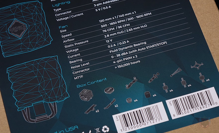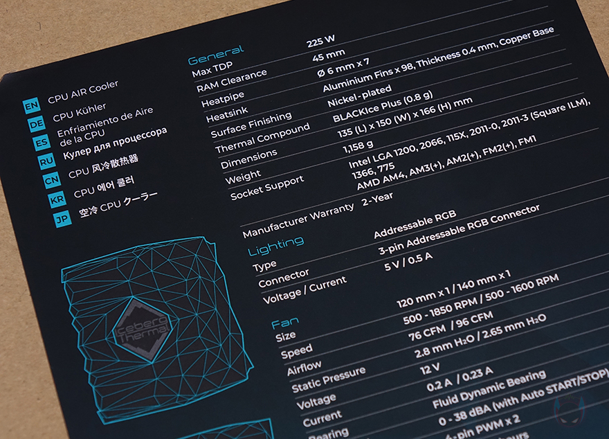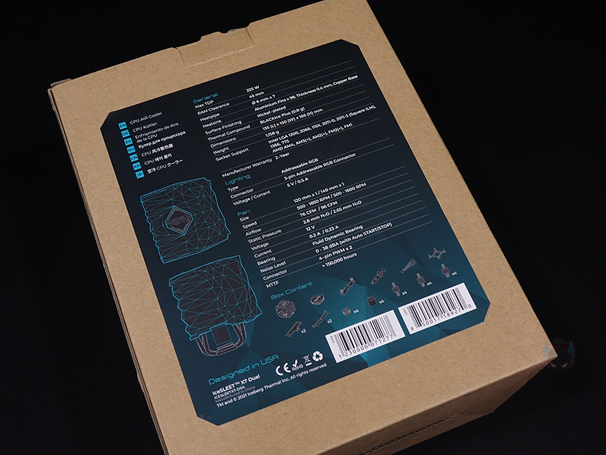 그리고, 박스 후면에는 제품의 기본 사양을 상세하게 표기하고 있는데, 최대 TDP부터 메모리 높이, 히트파이프, 도금, ARGB 지원, 팬 사양 등 상세하게 표기해 놨기 때문에 구입 전에 충분히 도움이 됩니다. 물론, 부속품 목록도 확인할 수 있죠. 박스를 열어보면, 부속품 박스와 쿨러가 포장된 박스로 각각 분류되어 있으며, 제품구성은 IceSLEET X7 Dual 쿨러, 인텔용 백플레이트, 인텔용 브라켓, AMD용 브라켓, 마운트, 소켓별로 동봉된 각 종 나사 및 너트, Y자 연장 팬-케이블, 써멀컴파운드, 제품설명서로 이루어져 있습니다.