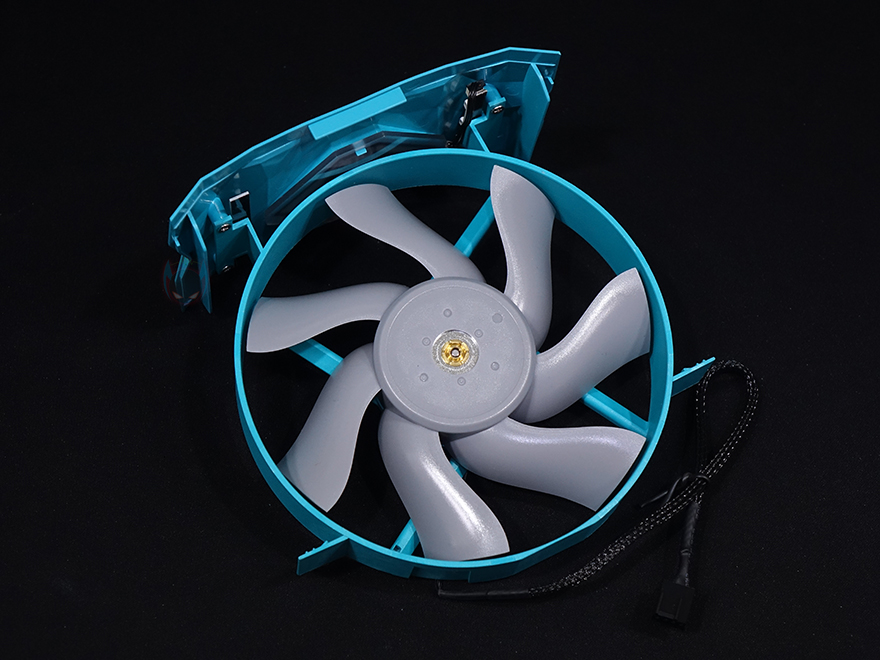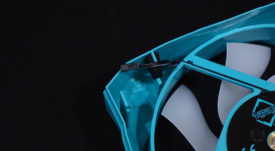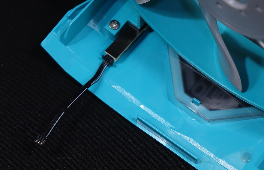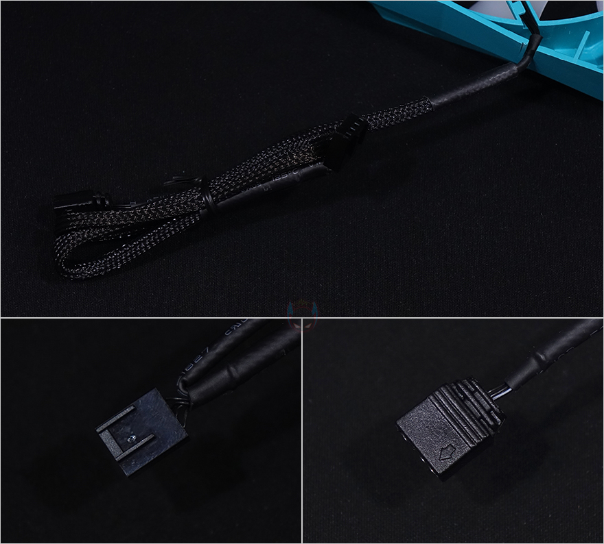 전면과 후면의 커버는 IceSLEET X6 쿨러와 마찬가지로 안쪽 양쪽에 걸쇠식이라 쉽게 분리가 됩니다. 분리하면 전면 120mm 팬 커버 안쪽 윗부분에 방금 140mm 팬 상단에서 확인했던 ARGB 조명효과를 위한 케이블과 연결되는 케이블을 확인할 수 있으며, 팬 케이블에 ARGB 케이블이 연장식으로 함께 연결되어 있습니다. 케이블은 모두 깔끔하게 슬리빙처리되어 있죠. 그리고, ARGB는 당연히 3pin 방식으로 메인보드 ARGB 헤더와 연결됩니다.