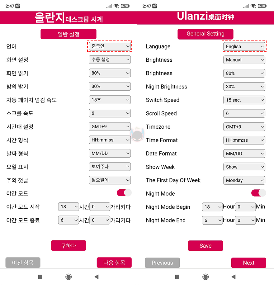 TC001 Smart Pixel Clock이 Wi-Fi 연결이 되면, 기능설정을 할 수 있는 IP주소를 전면 디스플레이에 보여주는데, 연결된 PC나 스마트폰에서 웹 브라우저를 통해 IP주소를 입력하면 설정화면이 나옵니다. 첫 화면은 일반설정(General Setting)으로 언어 설정은 중국어(Chinese)/영어(English) 둘 중 하나만 선택할 수 있는데, 한가지 팁(Tip)을 알려주자면, 구글 브라우저(Google browser)에서 설정 IP주소로 들어가면 중국어 선택 시 자동으로 한글 번역이 됩니다. 물론, 완벽한 번역은 아니지만, 그래도 첫 이용자라면 중국어 선택으로 하는 게 좀 더 편할 수 있습니다. 일반설정에는 언어 외에도 화면밝기(Brightness), 야간모드밝기(Night Brightness), 화면 자동 전환 속도, 스크롤 속도, 시간대 설정(Timezone), 시간형식, 날짜형식, 요일표시, 일주일 첫날 설정, 야간모드 시간설정을 할 수 있습니다.
