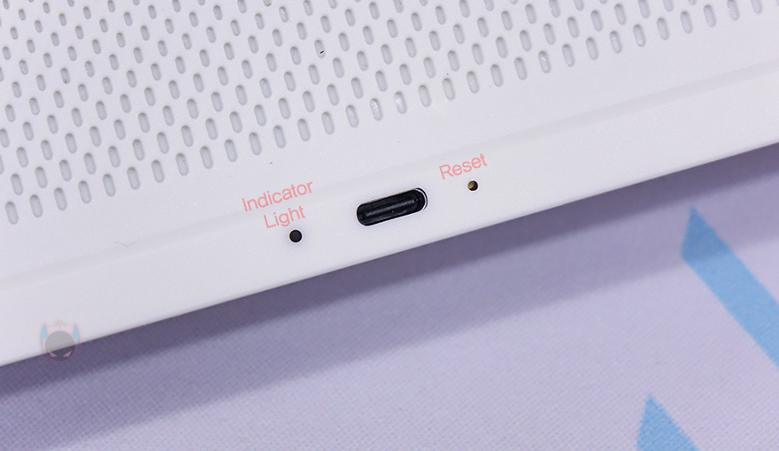 후면에는 일정 패턴 디자인과 함께 왼쪽에 비프음을 낼 수 있는 부저 스피커(Buzzer Outlet)가 배치되어 있으며, 중간위치 맨 아래에는 USB 충전케이블과 연결되는 USB Type-C 포트 배치를 기준으로 왼쪽에는 충전 연결상태를 확인할 수 있는 내장 LED(Indicator Light)가 배치되어 있으며, 오른쪽에는 리셋(Reset) 버튼이 배치되어 있습니다. 그리고, 제품 밑바닥에는 양쪽에 미끄럼방지 패드를 부착해 놨으며, 맨 왼쪽에 모델명과 함께 배터리 용량과 충전시간 표기를 확인할 수 있습니다.