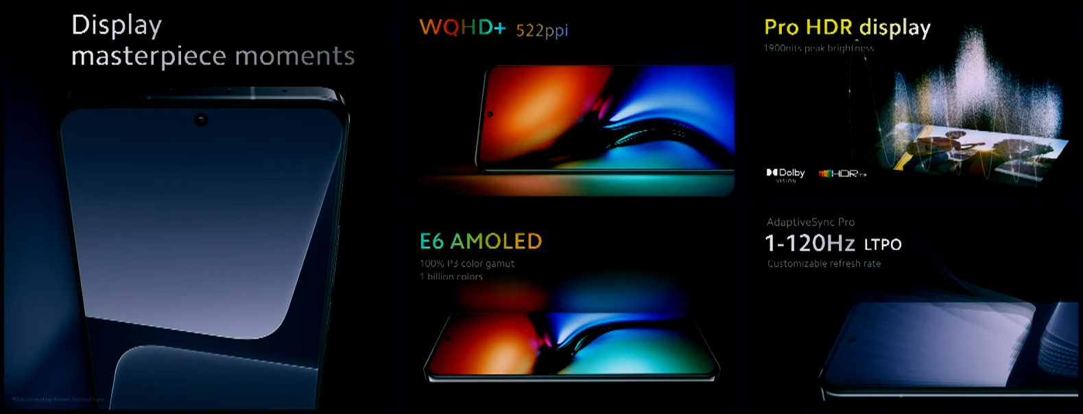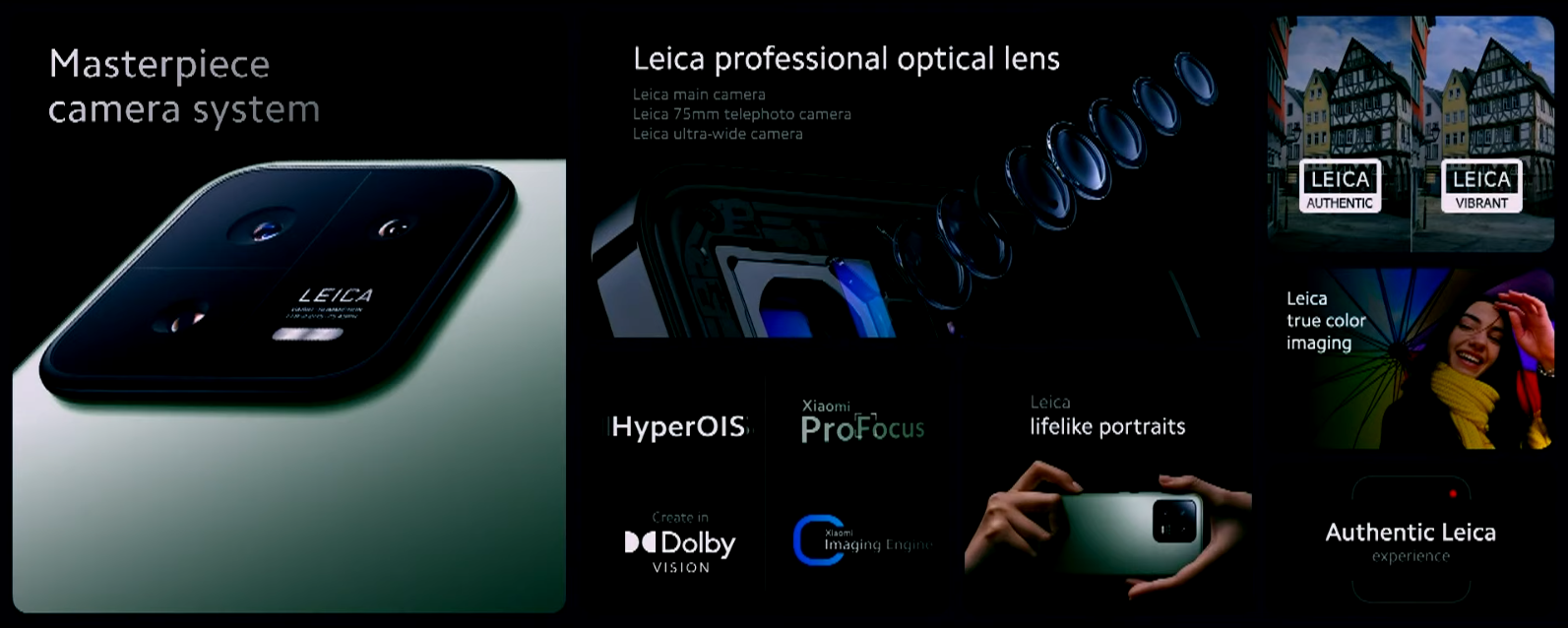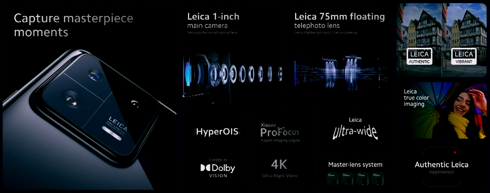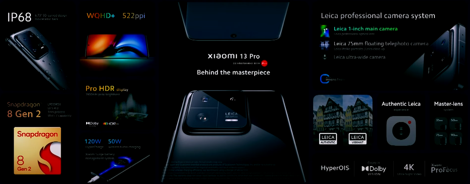샤오미 13 시리즈의 최상급 모델인 샤오미 13 Pro는 퀄컴 스냅드래곤 8 Gen2 APU 탑재를 비롯해, 6.73인치 E6 아몰레드 디스플레이에 120Hz 화면주사율을 갖췄으며, 1440x3200 WQHD+ 해상도, 522ppi 픽셀밀도로 한층 더 선명한 화질을 제공되도록 했으며, 이전 모델이 이어서 이번 13 Pro에서도 카메라 전문브랜드 라이카(Leica) 1인치 카메라를 메인으로 탑재했는데, 후면 트리플 카메라는 모두 5천만화소로 적용되었고, 8K 24프레임 동영상 촬영까지 지원한다. 또한, 배터리는 4820mAh 용량으로 유선 고속충전은 120W, 무선 고속충전 50W, 공유충전 10W를 갖췄고, IP68등급 방수방진을 적용했다.